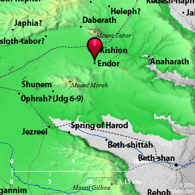 Atlas ![]() En-dor (Endor) and surrounding area Maps Created using Biblemapper 3.0 Additional data from OpenBible.info You are free to use up to 50 Biblos coprighted maps (small or large) for your website or presentation. Please credit Biblos.com. Occurrences Joshua 17:11 Manasseh had three heights in Issachar, in Asher Beth Shean and its towns, and Ibleam and its towns, and the inhabitants of Dor and its towns, and the inhabitants of Endor and its towns, and the inhabitants of Taanach and its towns, and the inhabitants of Megiddo and its towns.1 Samuel 28:7 Then said Saul to his servants, "Seek me a woman who has a familiar spirit, that I may go to her, and inquire of her." His servants said to him, "Behold, there is a woman who has a familiar spirit at Endor." 1 Samuel 28:18 Because you didn't obey the voice of Yahweh, and didn't execute his fierce wrath on Amalek, therefore Yahweh has done this thing to you this day. Encyclopedia EN-DORen'-dor `en dor, Joshua 17:11; `en dor, 1 Samuel 28:7; `en do'r, Psalm 83:10; Codex Alexandrinus, Nendor; Codex Vaticanus, Aeldor: EN'DOR, spring of Dor, in Issachar, but possessed by Manasseh, now Endur, on the n. side of a high hill and 58 ms. n. of Jerusalem. The hill is a spur of the hill of Moreh. Strong's Hebrew H5874: En-dor or En Dor or En-dor"spring of dwelling," a town in Manasseh |