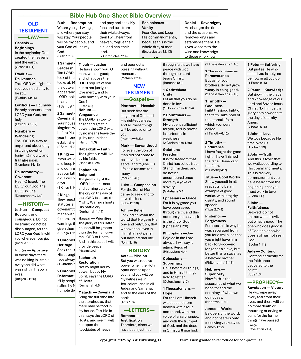 The BibleHub One-Sheet Bible Overview brings the whole story of Scripture together on a single printable page. From Genesis to Revelation, each book includes a short theme and a key verse that captures its central message. It is a clear, simple way to see God's unfolding plan from creation to covenant to Christ at a glance.