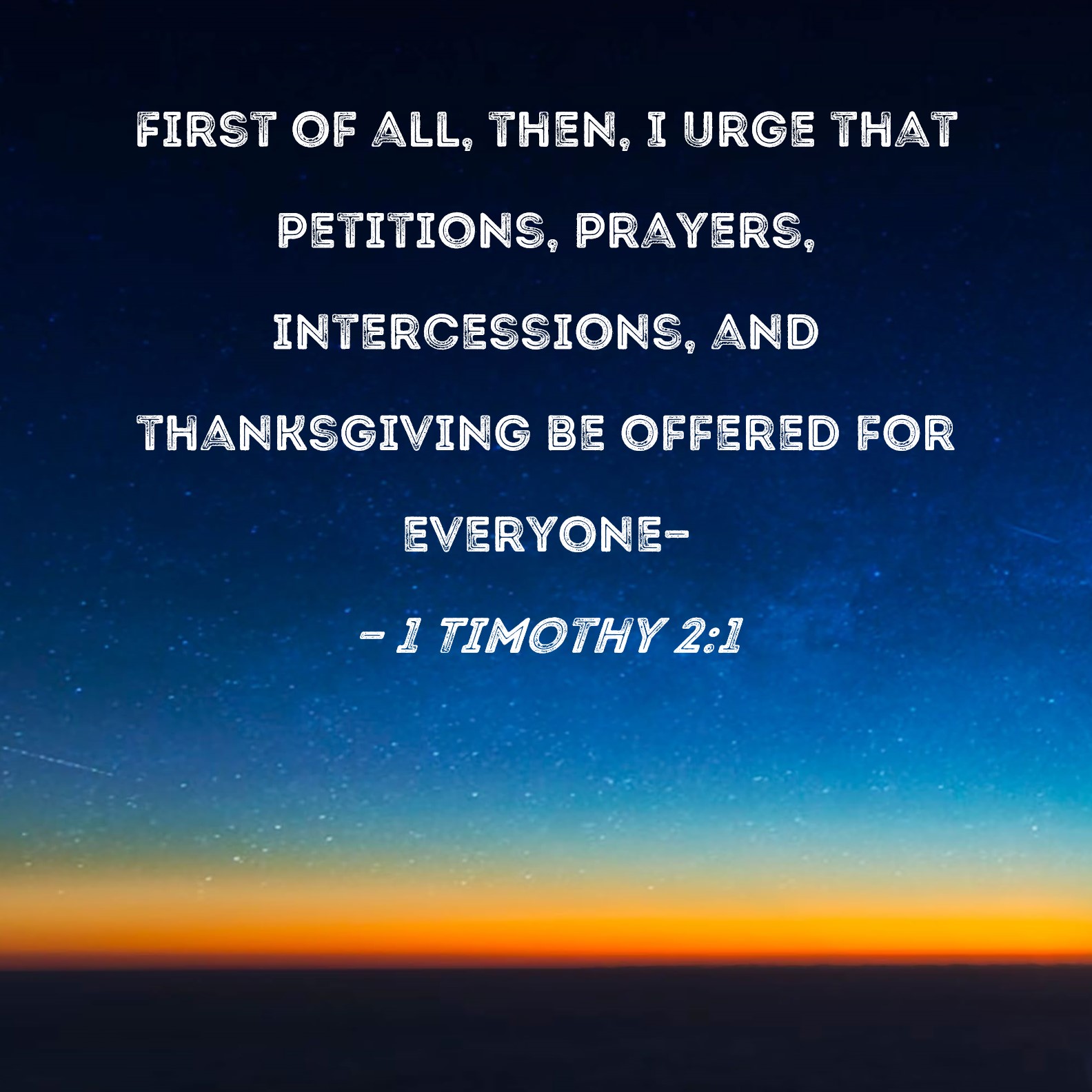 1 Timothy 2:1 First of all, then, I urge that petitions, prayers, intercessions, and thanksgiving be offered for everyone--