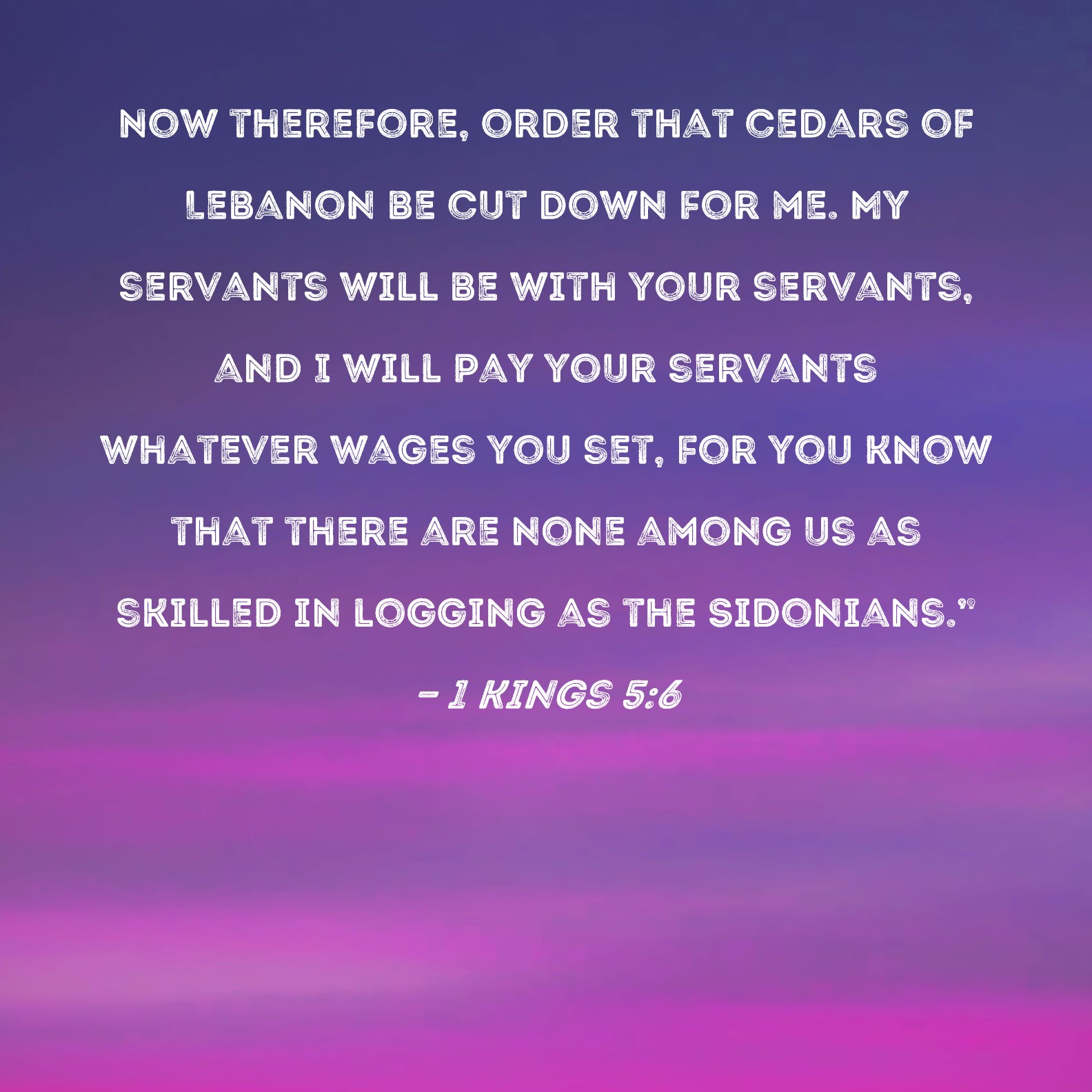 1 Kings 5:6 Now therefore, order that cedars of Lebanon be cut down for me. My servants will be with your servants, and I will pay your servants whatever wages you set, for you know that there are none among us as skilled in logging as the Sidonians."