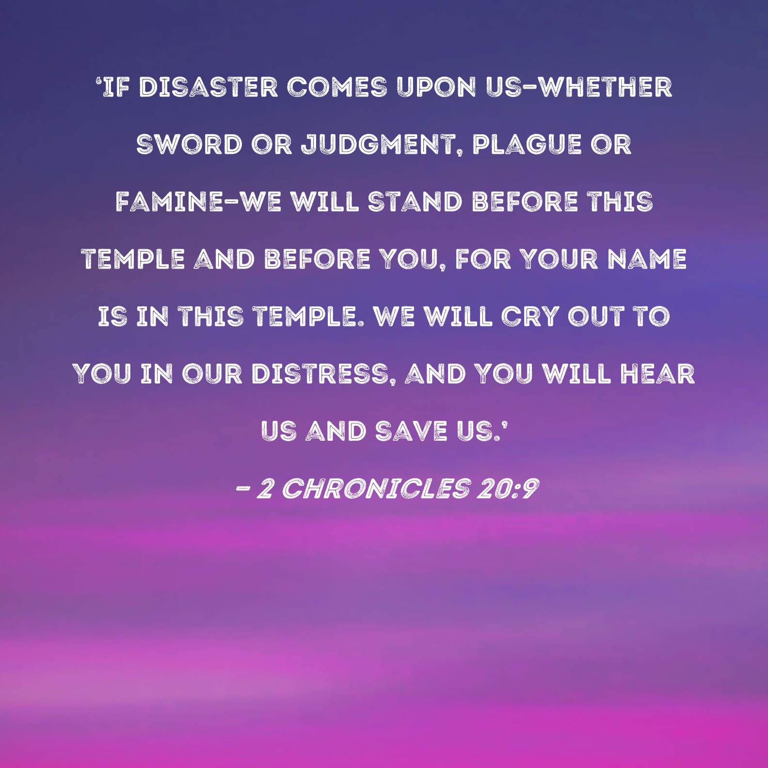2 Chronicles 20:9 If disaster comes upon us--whether sword or judgment, plague or famine--we will stand before this temple and before You, for Your Name is in this temple. We will cry out to You in our distress, and You will hear us and save us.'