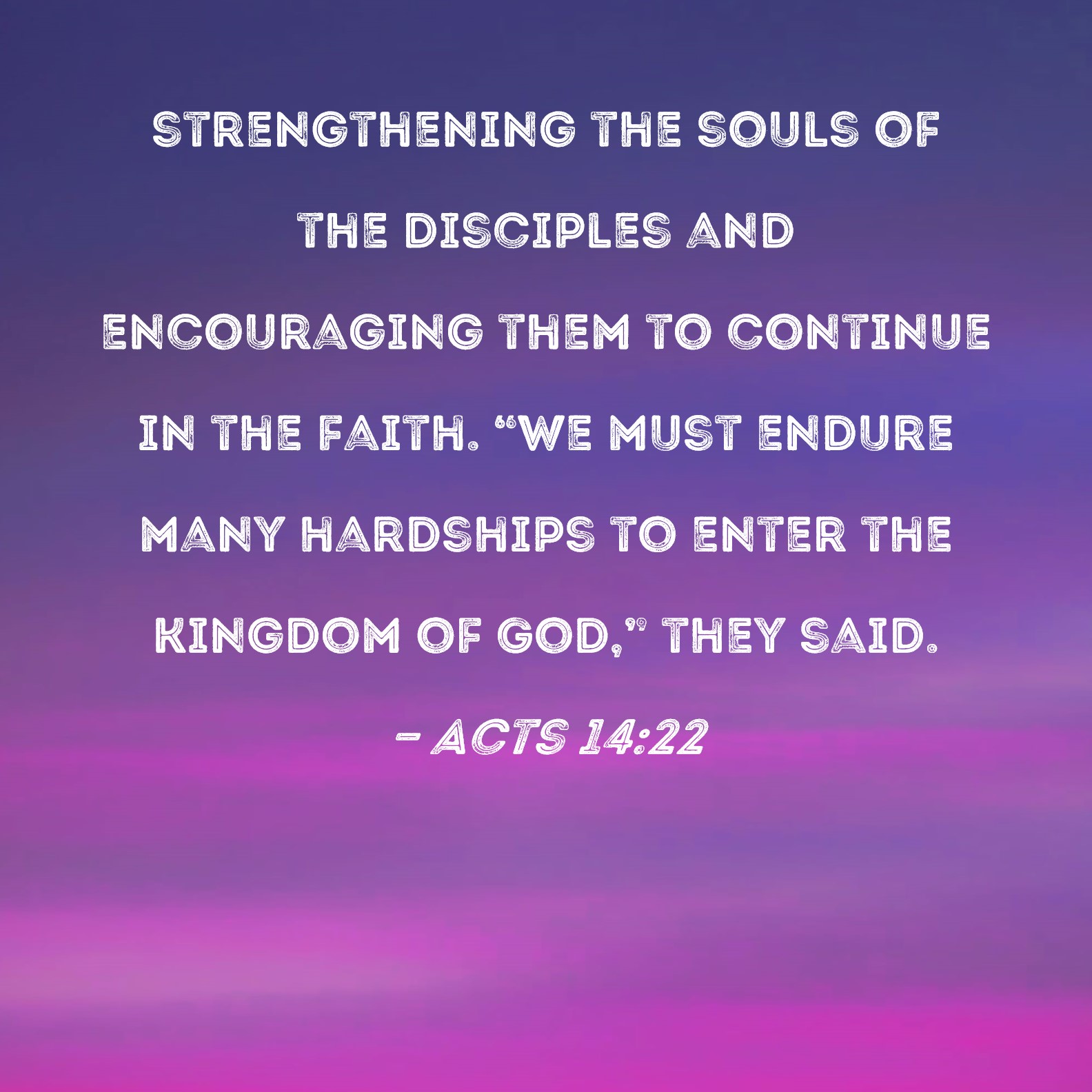 Acts 14:22 strengthening the souls of the disciples and encouraging them to continue in the faith. "We must endure many hardships to enter the kingdom of God," they said.