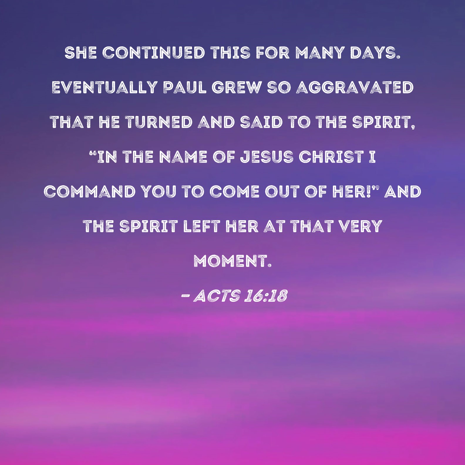 Acts 16:18 She continued this for many days. Eventually Paul grew so aggravated that he turned and said to the spirit, "In the name of Jesus Christ I command you to come out of her!" And the spirit left her at that very moment.