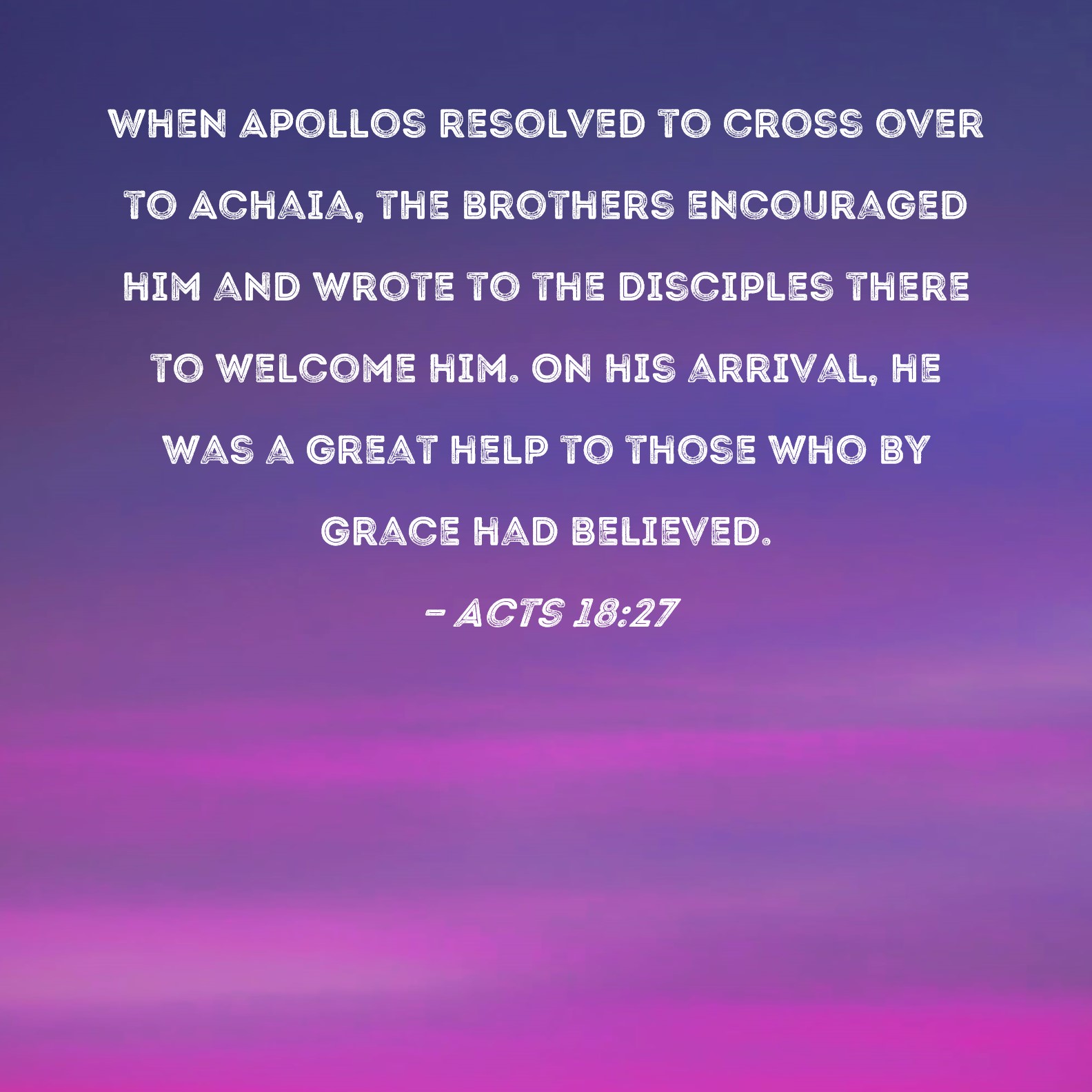 Acts 18:27 When Apollos resolved to cross over to Achaia, the brothers encouraged him and wrote to the disciples there to welcome him. On his arrival, he was a great help to those who by grace had believed.