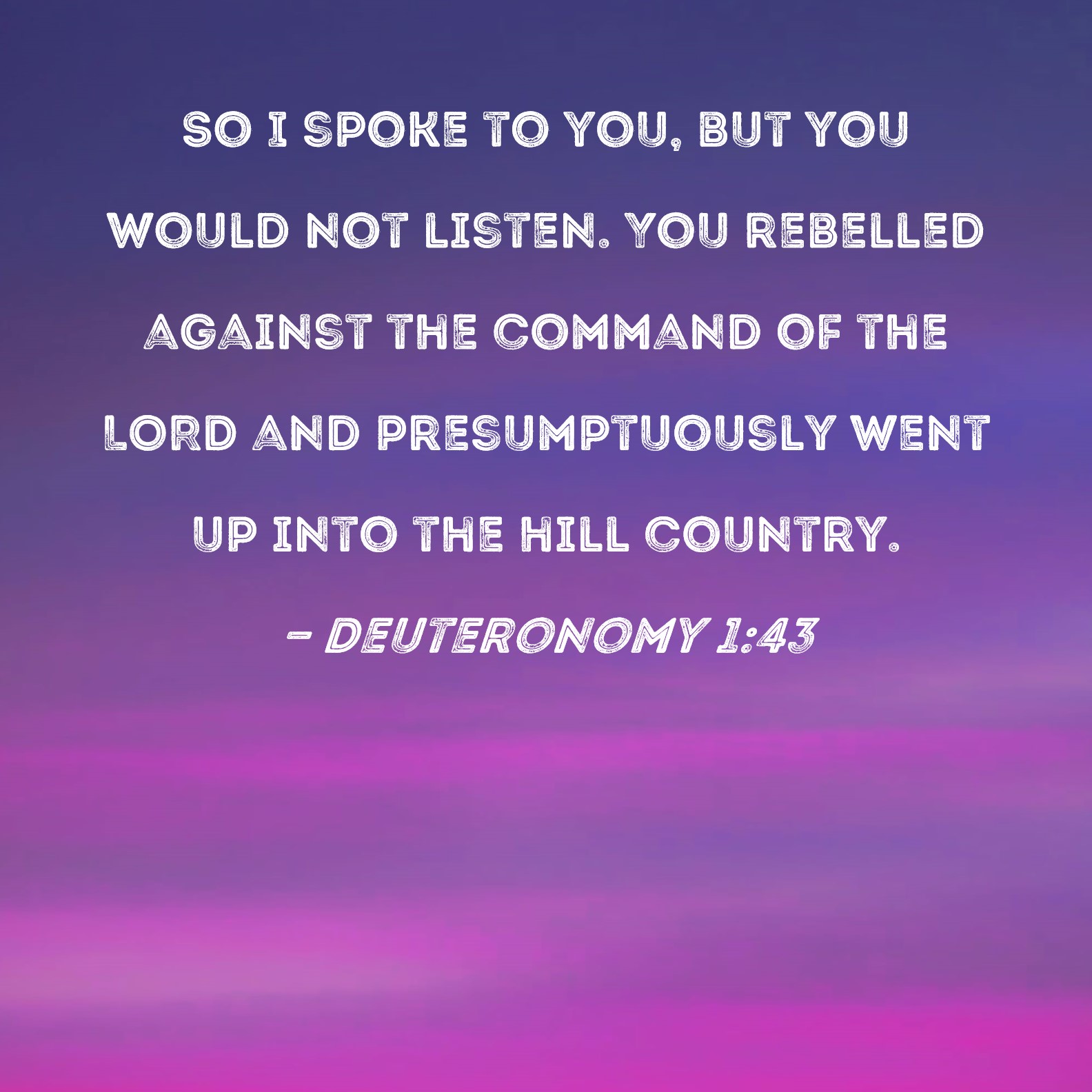 Deuteronomy 1:43 So I spoke to you, but you would not listen. You rebelled against the command of the LORD and presumptuously went up into the hill country.