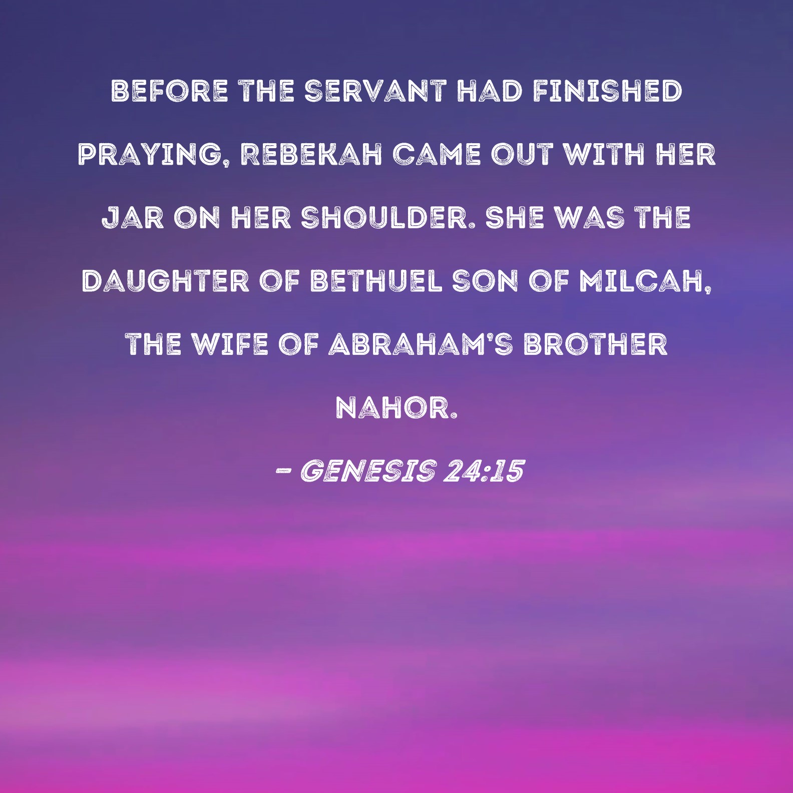 Genesis 24:15 Before the servant had finished praying, Rebekah came out with her jar on her shoulder. She was the daughter of Bethuel son of Milcah, the wife of Abraham's brother Nahor.