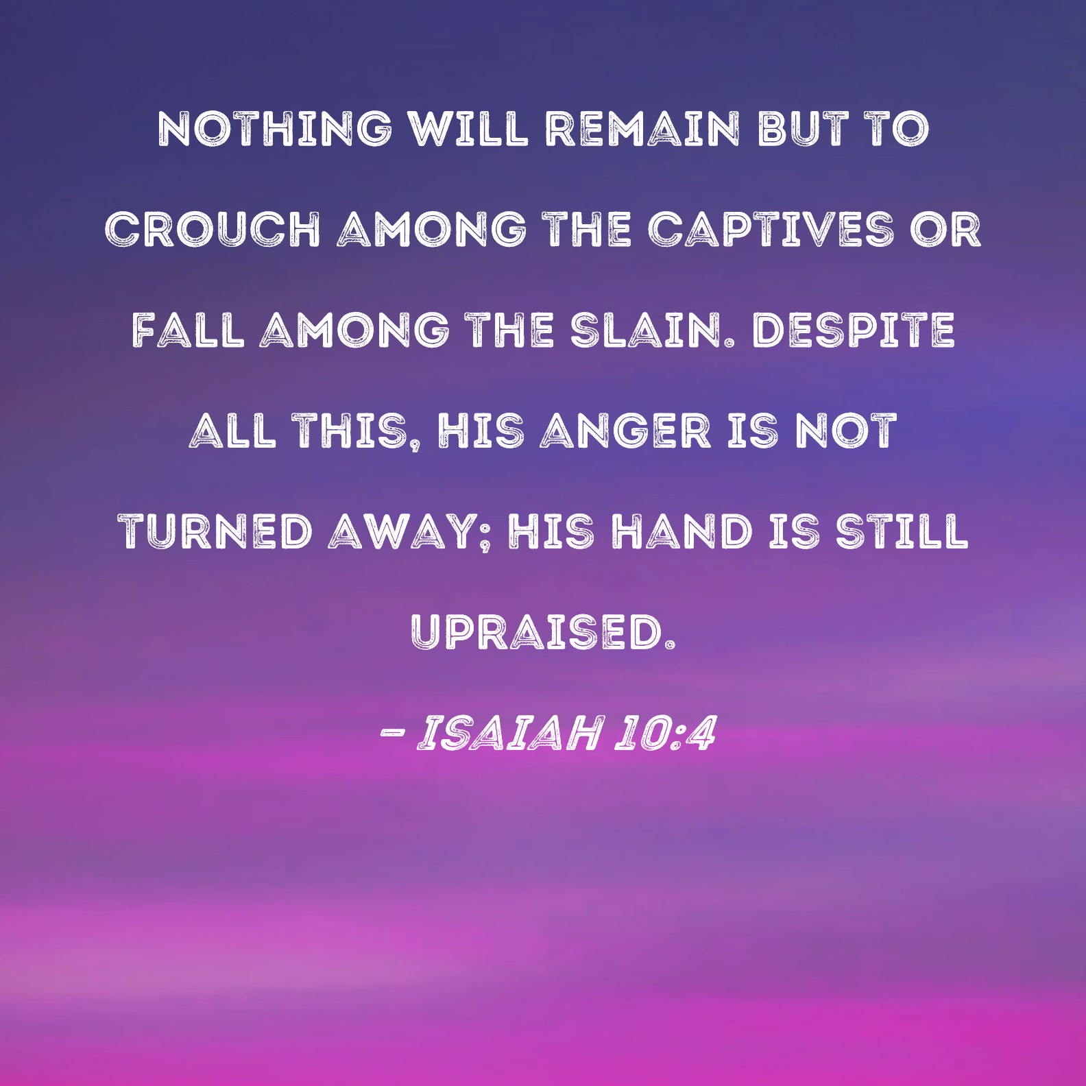 Isaiah 10:4 Nothing will remain but to crouch among the captives or fall among the slain. Despite all this, His anger is not turned away; His hand is still upraised.
