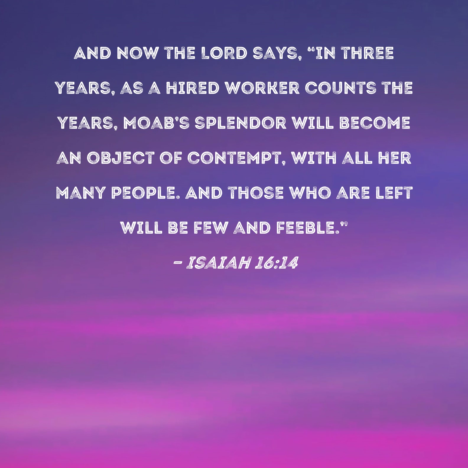Isaiah 16:14 And now the LORD says, "In three years, as a hired worker counts the years, Moab's splendor will become an object of contempt, with all her many people. And those who are left will be few and feeble."