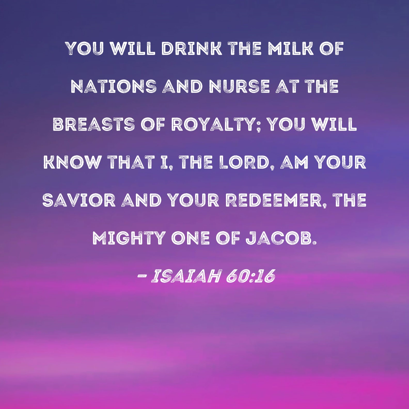 Isaiah 60:16 You will drink the milk of nations and nurse at the breasts of royalty; you will know that I, the LORD, am your Savior and your Redeemer, the Mighty One of Jacob.