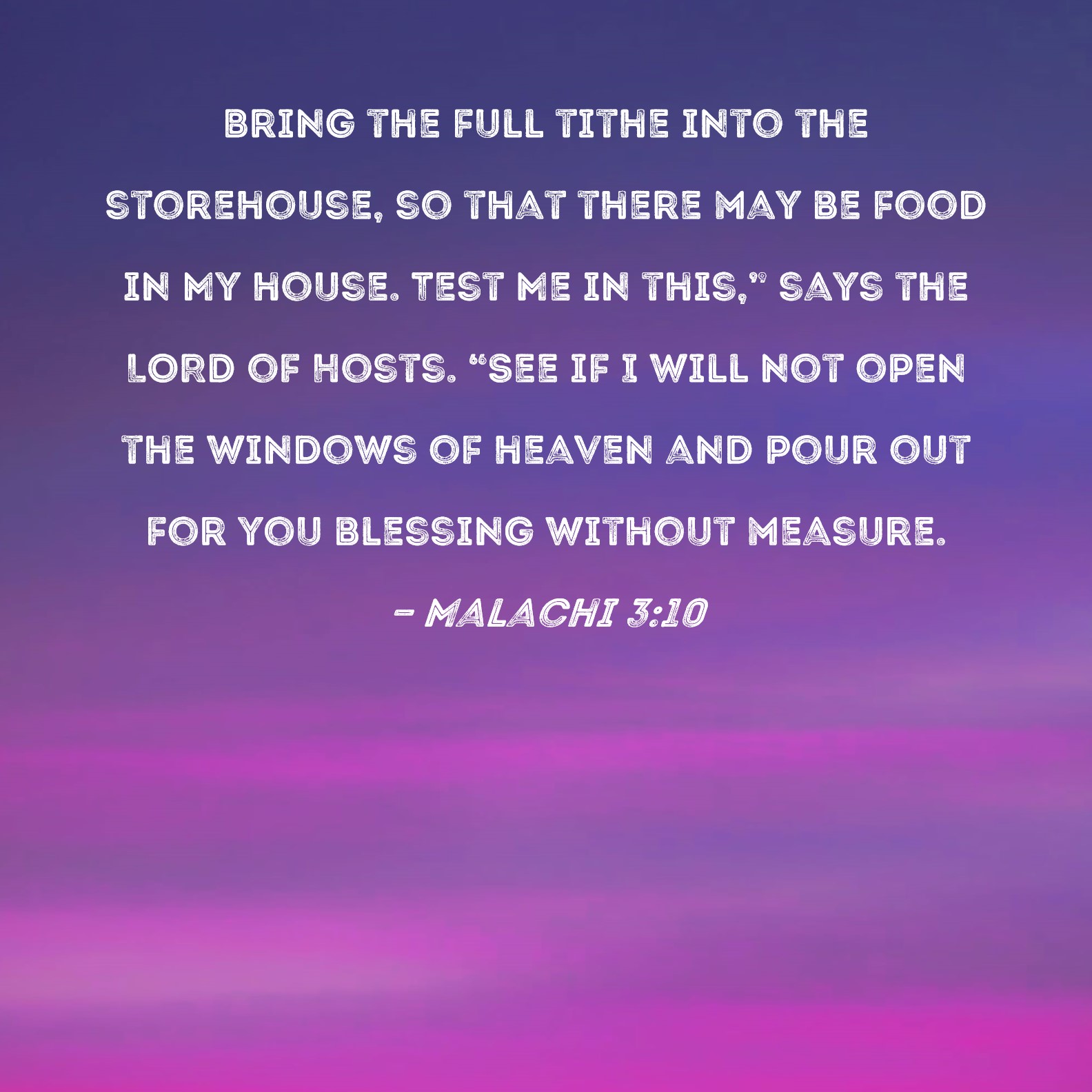 Malachi 3:10 Bring the full tithe into the storehouse, so that there may be food in My house. Test Me in this," says the LORD of Hosts. "See if I will not open the windows of heaven and pour out for you blessing without measure.