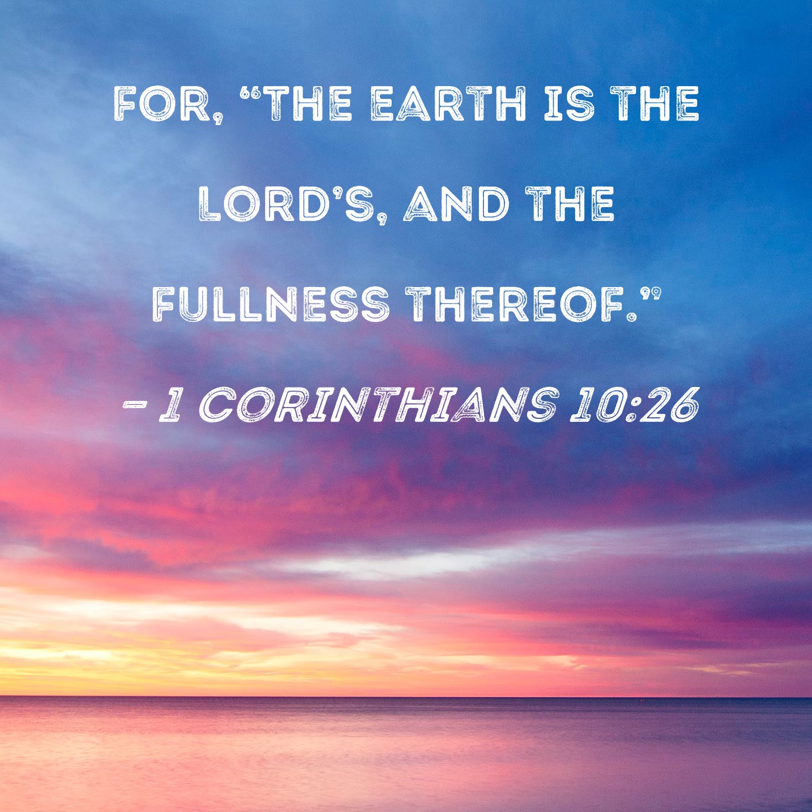 BSB: for, "The earth is the Lord's, and the fullness thereof." KJV: For the earth is the Lord's, and the fulness thereof. DRB: The earth is the Lord's, and the fulness thereof. DBT: For the earth is the Lord's and its fulness. ERV: for the earth is the Lord's, and the fulness thereof. WBT: For the earth is the Lord's, and its fullness. WEB: for “the earth is the Lord’s, and its fullness.” YLT: for the Lord's is the earth, and its fulness;Links 1 Corinthians 10:26 NIV • 1 Corinthians 10:26 NLT • 1 Corinthians 10:26 ESV • 1 Corinthians 10:26 NASB • 1 Corinthians 10:26 KJV • 1 Corinthians 10:26 Interlinear • 1 Corinthians 10:26 Commentaries • 1 Corinthians 10:26 Parallel Texts • 1 Corinthians 10:26 Bible Apps • 1 Corinthians 10:26 Parallel • Bible Hub |