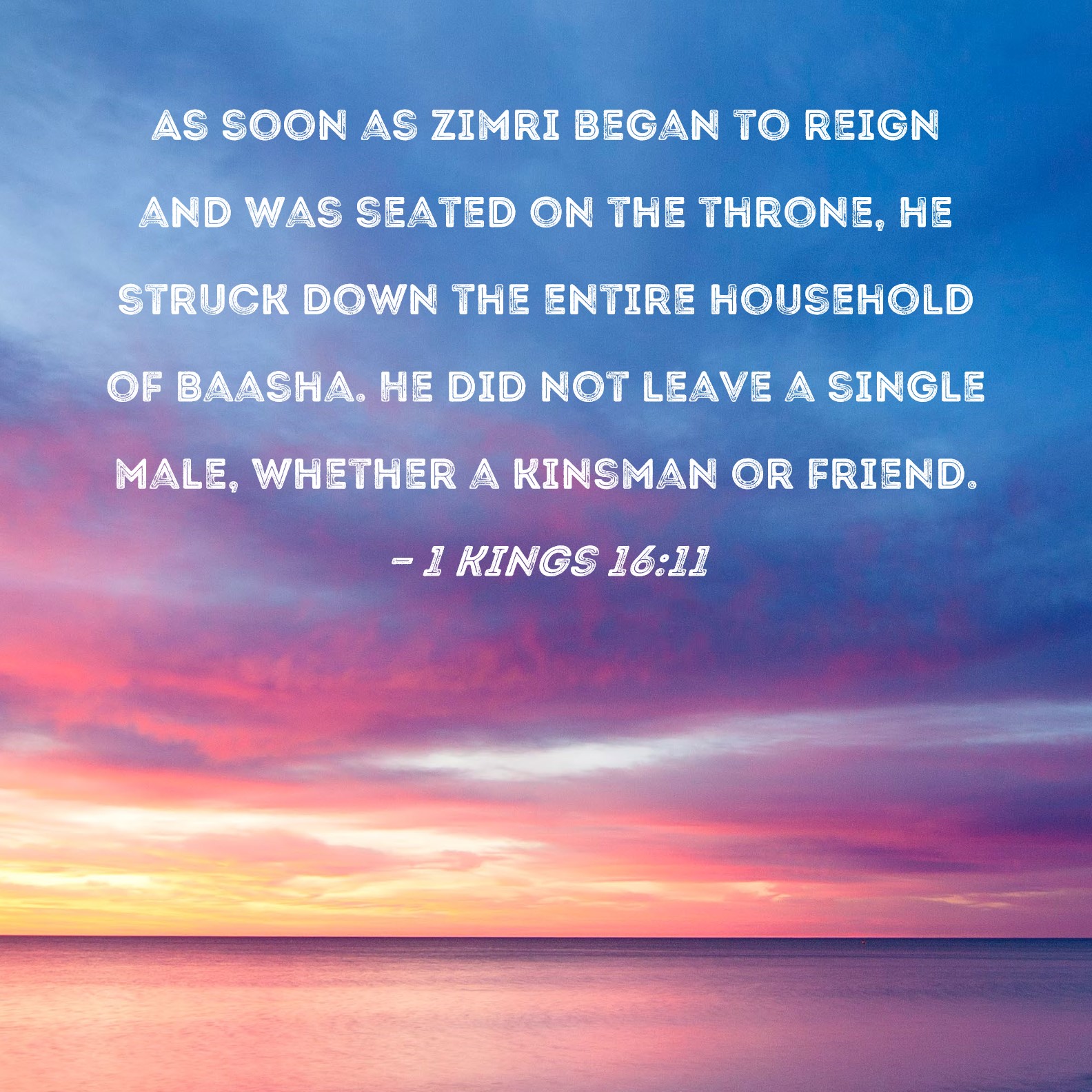 1 Kings 16:11 As soon as Zimri began to reign and was seated on the throne, he struck down the entire household of Baasha. He did not leave a single male, whether a kinsman or friend.
