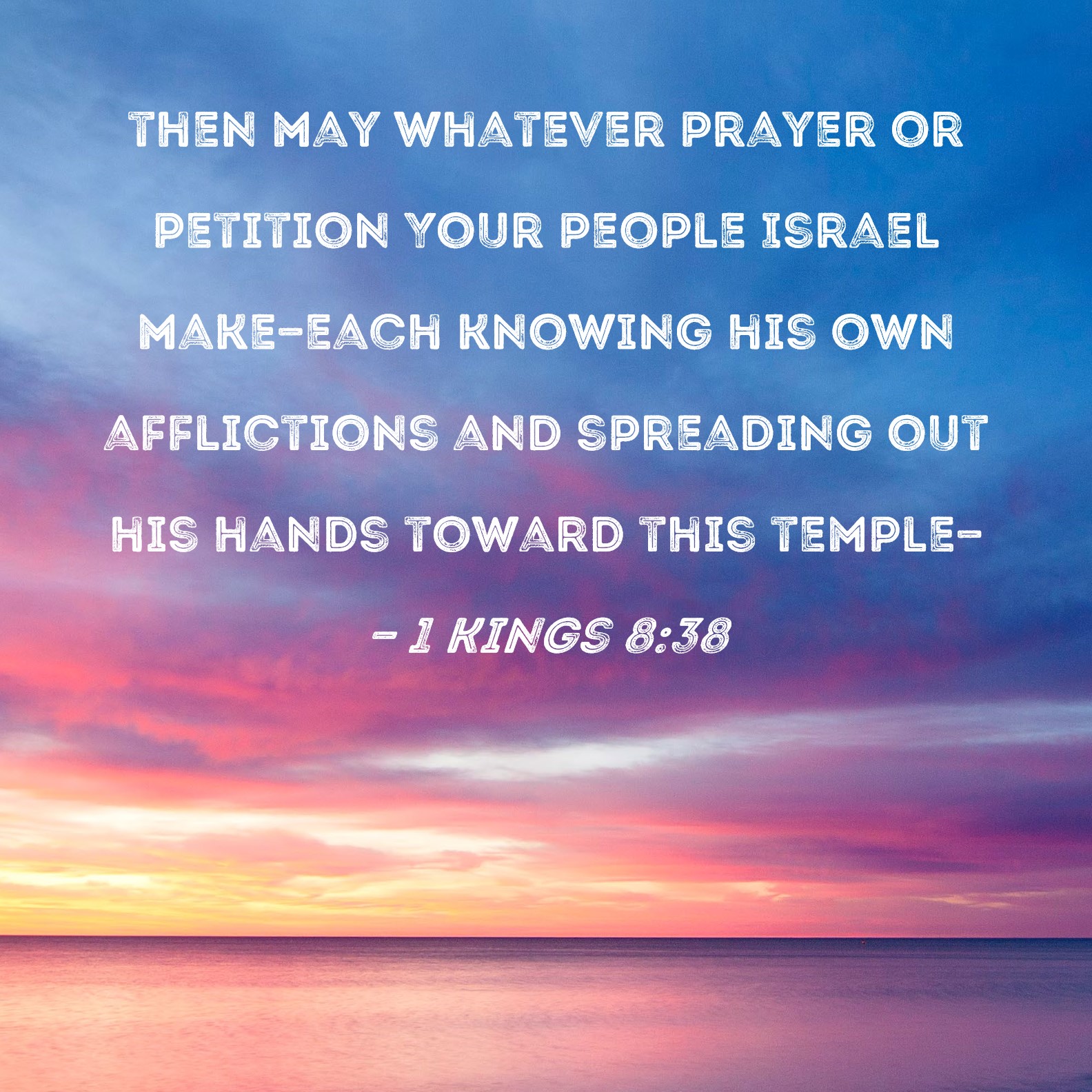 1 Kings 8:38 then may whatever prayer or petition Your people Israel make--each knowing his own afflictions and spreading out his hands toward this temple--
