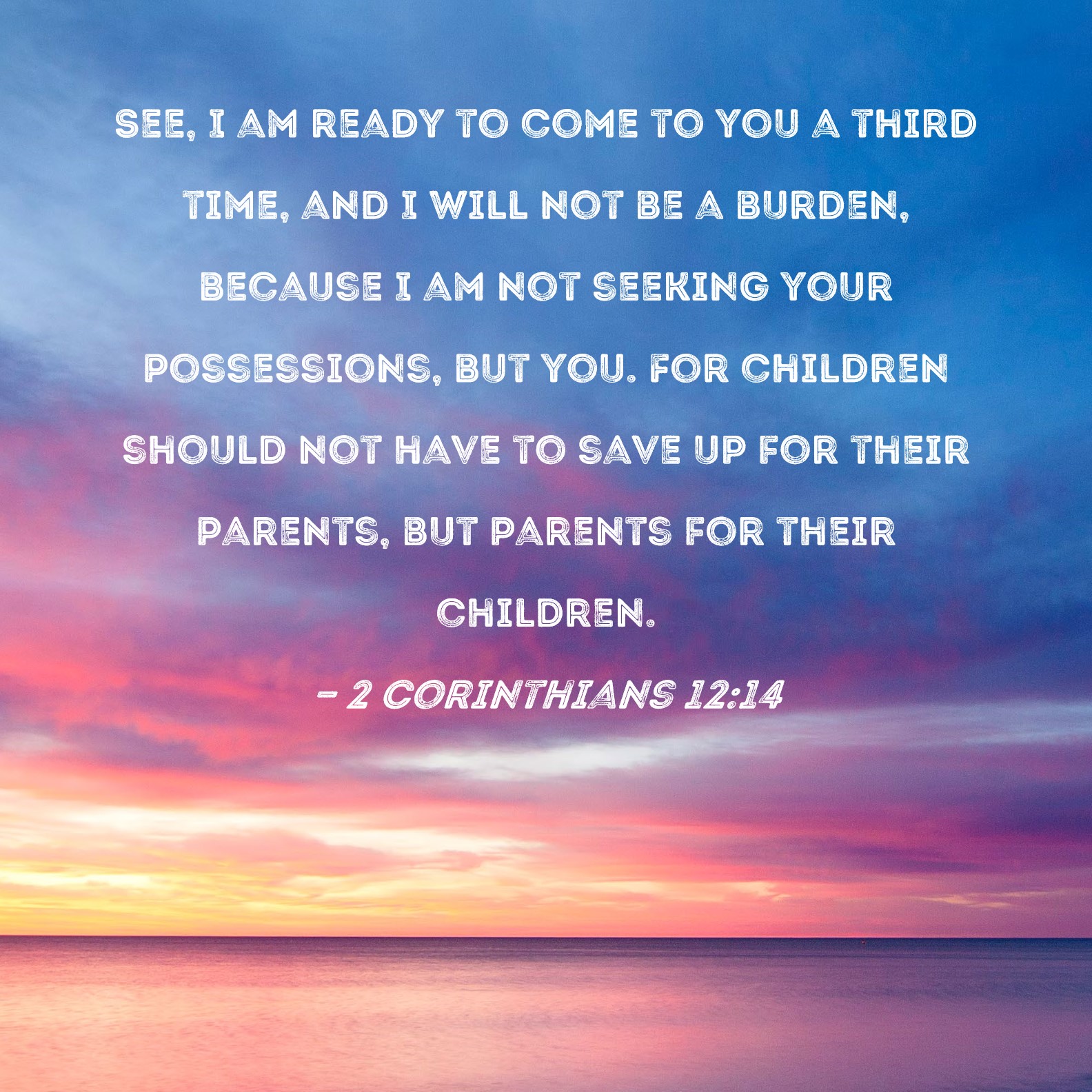 2 Corinthians 12:14 See, I am ready to come to you a third time, and I will not be a burden, because I am not seeking your possessions, but you. For children should not have to save up for their parents, but parents for their children.