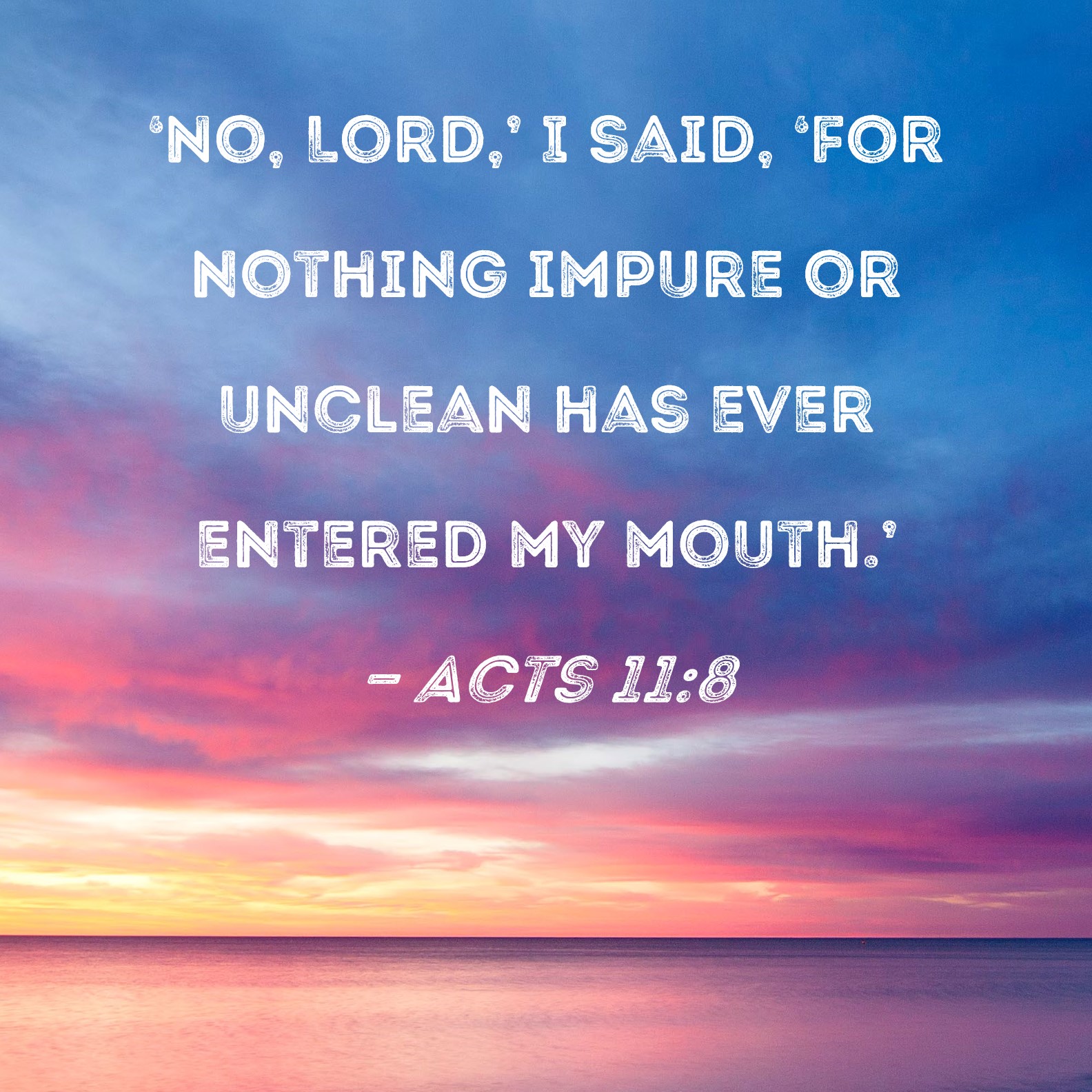Acts 11:8 No, Lord,' I said, 'for nothing impure or unclean has ever entered my mouth.'