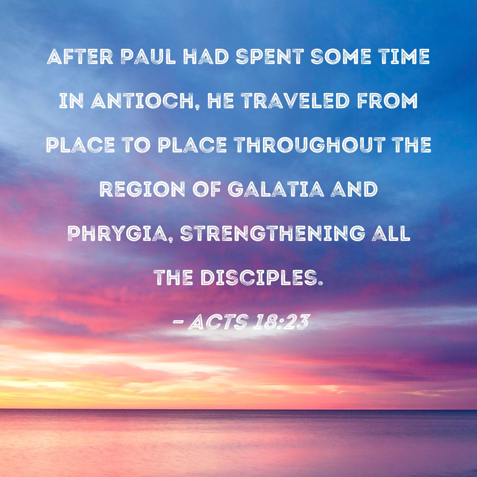 Acts 18:23 After Paul had spent some time in Antioch, he traveled from place to place throughout the region of Galatia and Phrygia, strengthening all the disciples.