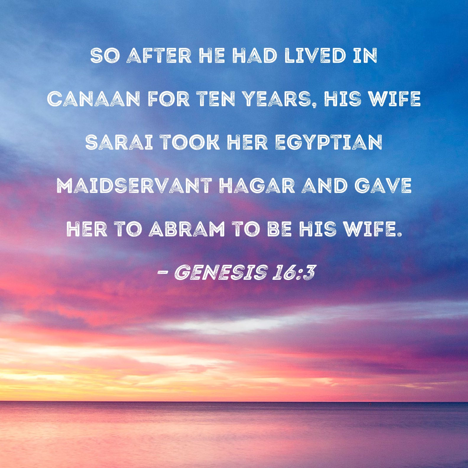 Genesis 16:3 So after he had lived in Canaan for ten years, his wife Sarai took her Egyptian maidservant Hagar and gave her to Abram to be his wife.