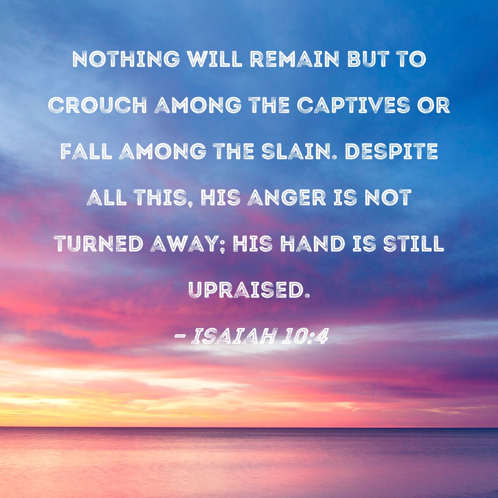 Isaiah 10:4 Nothing will remain but to crouch among the captives or fall among the slain. Despite all this, His anger is not turned away; His hand is still upraised.
