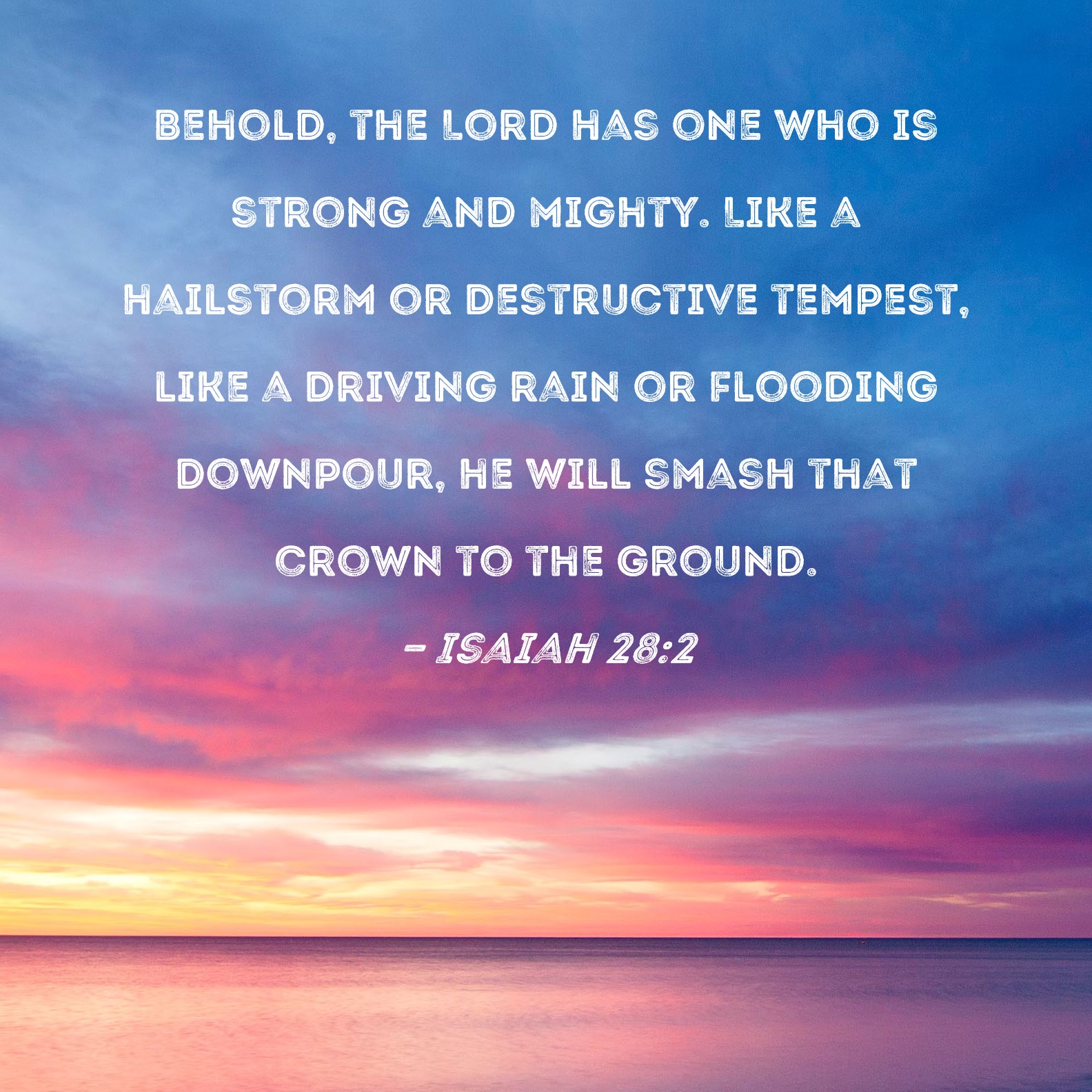 Isaiah 28:2 Behold, the Lord has one who is strong and mighty. Like a hailstorm or destructive tempest, like a driving rain or flooding downpour, he will smash that crown to the ground.