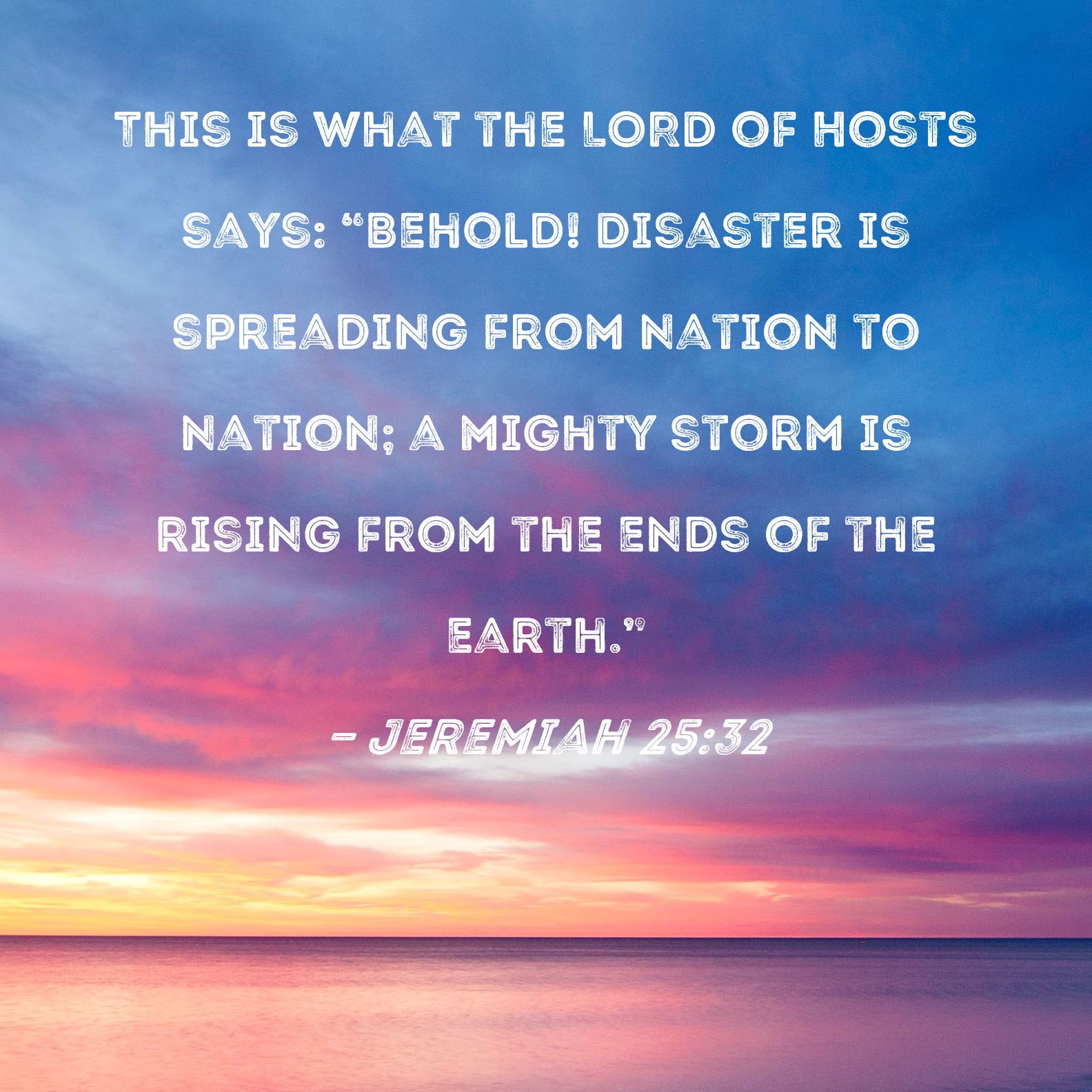 Jeremiah 25:32 This is what the LORD of Hosts says: "Behold! Disaster is spreading from nation to nation; a mighty storm is rising from the ends of the earth."