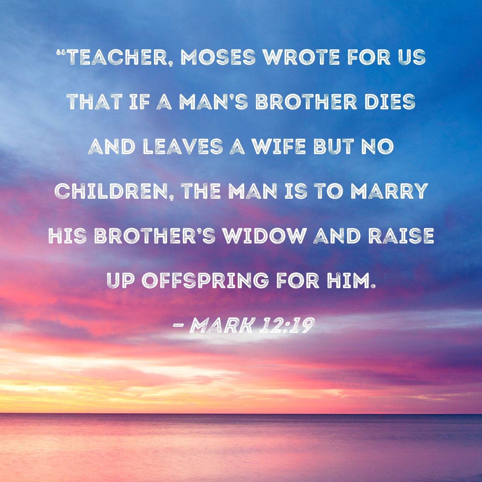 Mark 12:19 "Teacher, Moses wrote for us that if a man's brother dies and leaves a wife but no children, the man is to marry his brother's widow and raise up offspring for him.