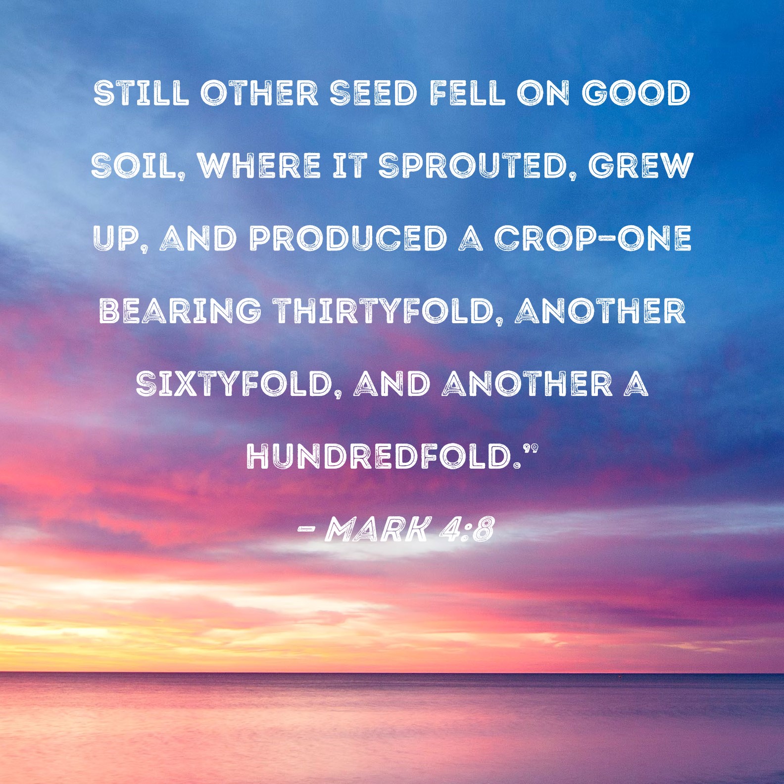 Mark 4:8 Still other seed fell on good soil, where it sprouted, grew up, and produced a crop--one bearing thirtyfold, another sixtyfold, and another a hundredfold."