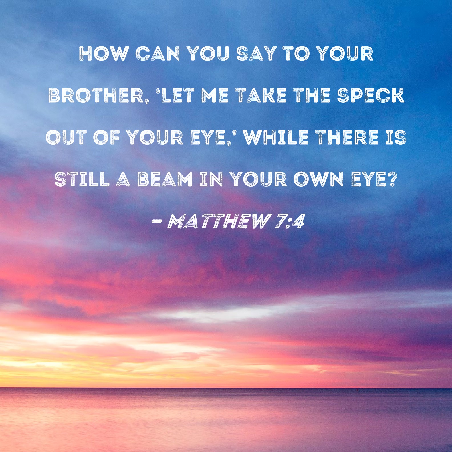 Matthew 7:4 How can you say to your brother, 'Let me take the speck out of your eye,' while there is still a beam in your own eye?