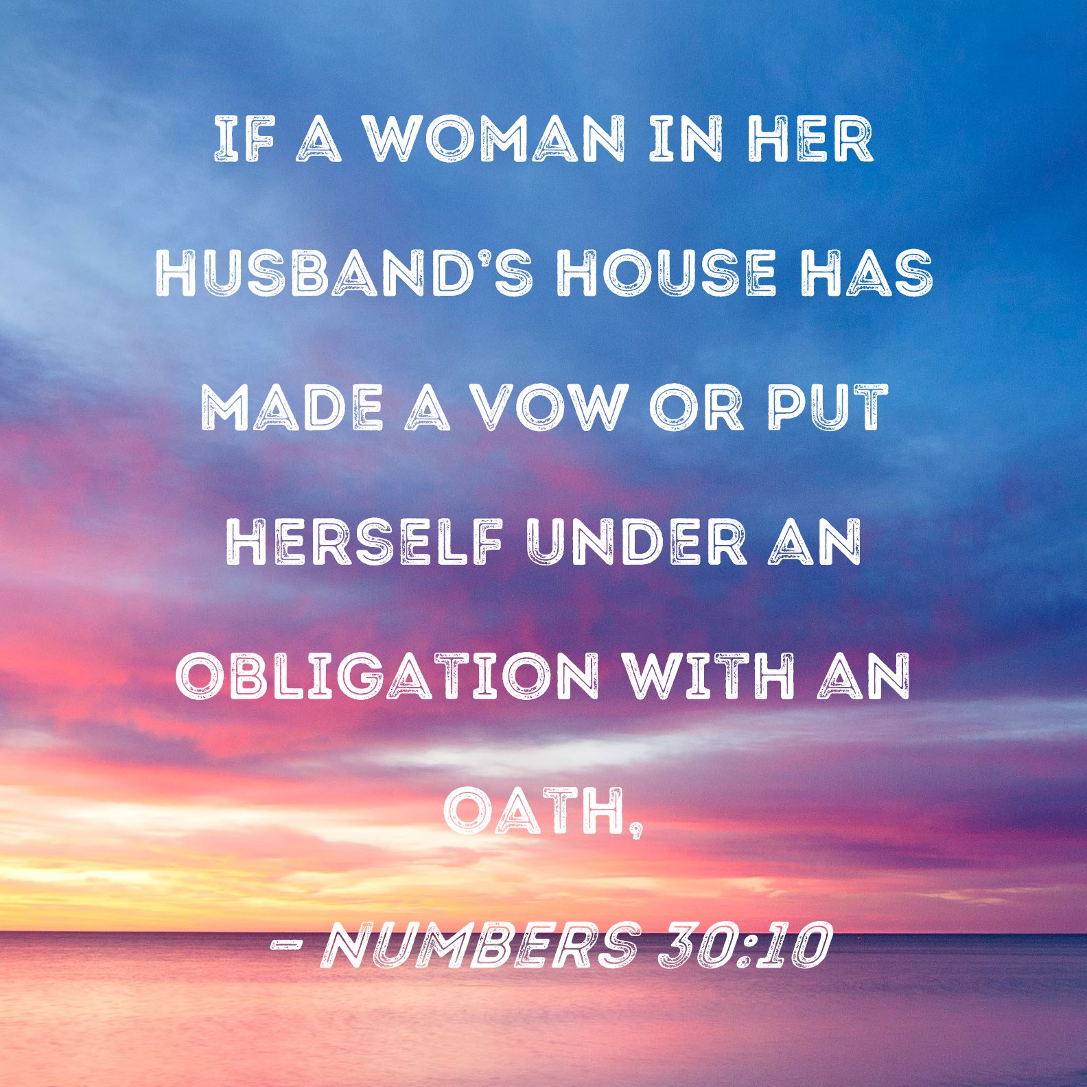 Numbers 30:10 If a woman in her husband's house has made a vow or put herself under an obligation with an oath,