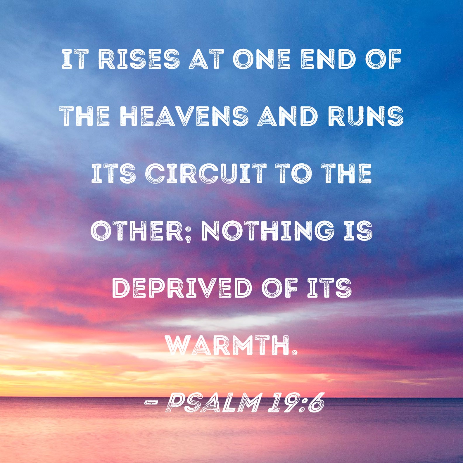 Psalm 19:6 it rises at one end of the heavens and runs its circuit to the other; nothing is deprived of its warmth.