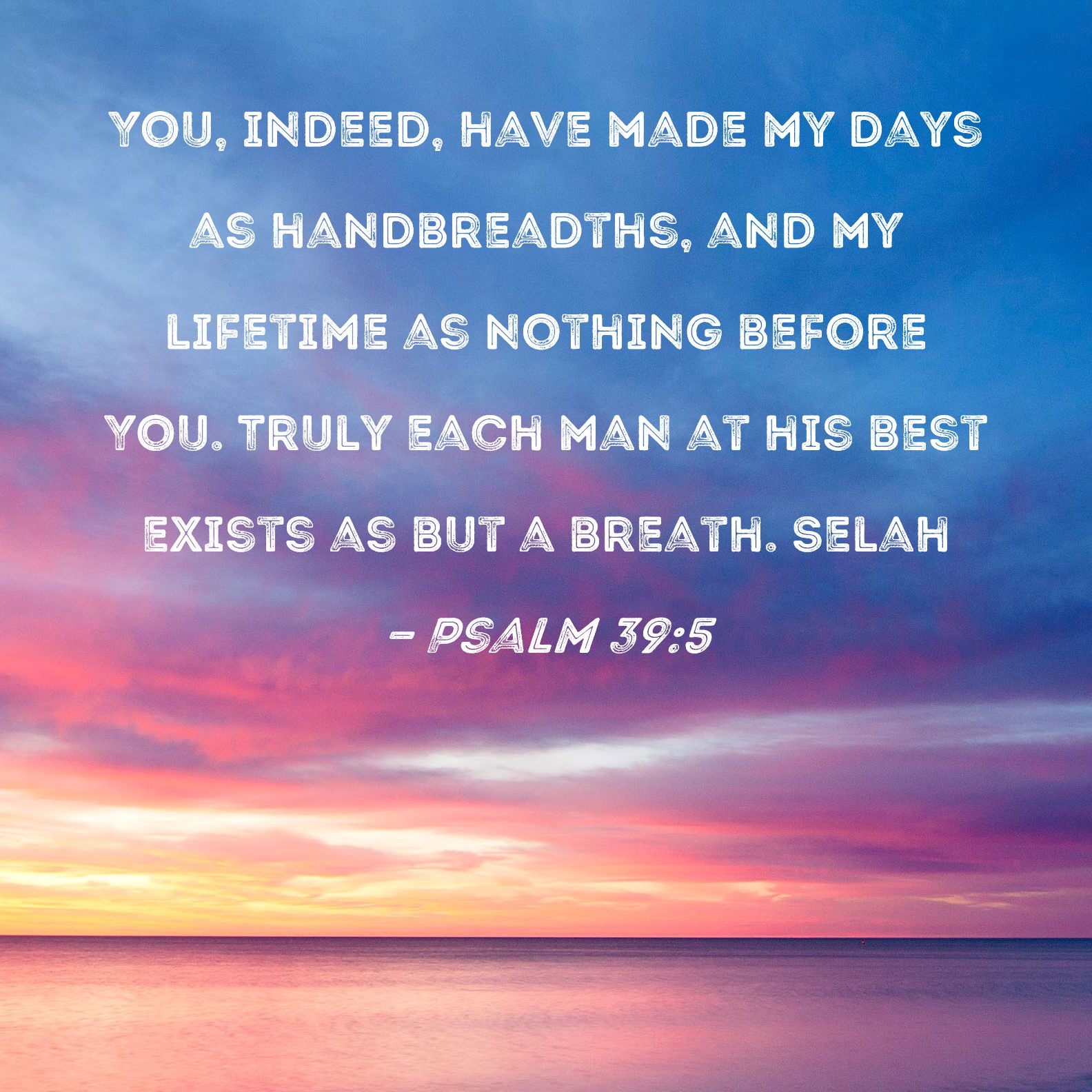 Psalm 39:5 You, indeed, have made my days as handbreadths, and my lifetime as nothing before You. Truly each man at his best exists as but a breath. Selah