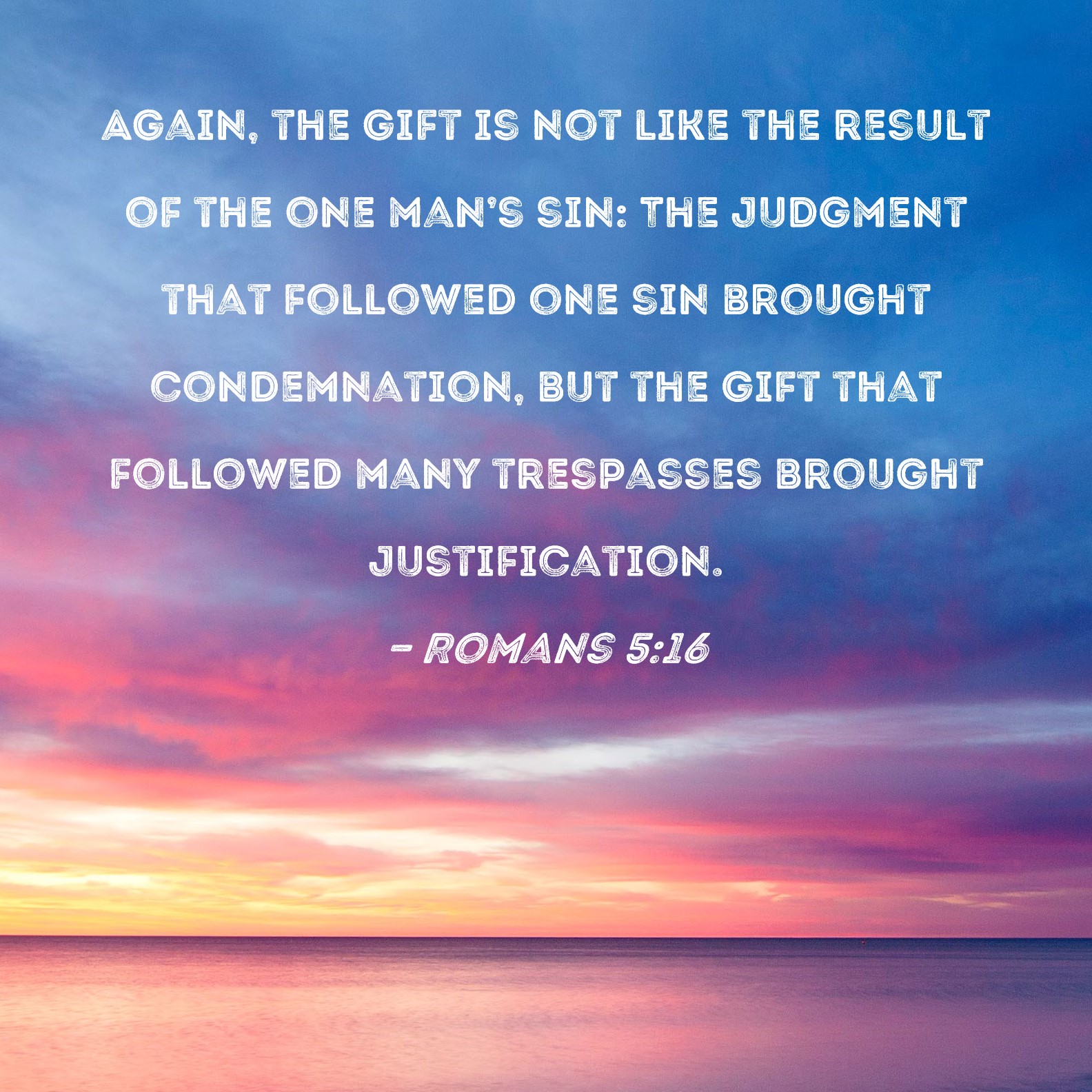 Romans 5:16 Again, the gift is not like the result of the one man's sin: The judgment that followed one sin brought condemnation, but the gift that followed many trespasses brought justification.