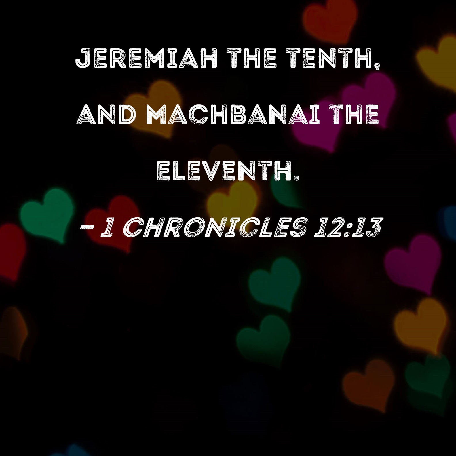 BSB: Jeremiah the tenth, and Machbanai the eleventh. KJV: Jeremiah the tenth, Machbanai the eleventh. DRB: Jerenias the tenth, Machbani the eleventh, DBT: Jeremiah the tenth, Machbannai the eleventh. ERV: Jeremiah the tenth, Machbannai the eleventh. WBT: Jeremiah the tenth, Machbanai the eleventh. WEB: Jeremiah the tenth, and Machbannai the eleventh. YLT: Jeremiah the tenth, Machbannai the eleventh.Links 1 Chronicles 12:13 NIV • 1 Chronicles 12:13 NLT • 1 Chronicles 12:13 ESV • 1 Chronicles 12:13 NASB • 1 Chronicles 12:13 KJV • 1 Chronicles 12:13 Interlinear • 1 Chronicles 12:13 Commentaries • 1 Chronicles 12:13 Parallel Texts • 1 Chronicles 12:13 Bible Apps • 1 Chronicles 12:13 Parallel • Bible Hub |