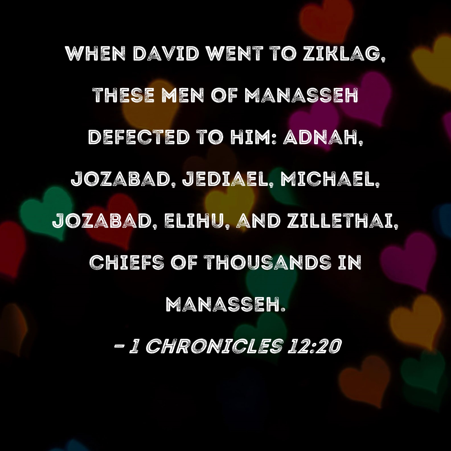 1 Chronicles 12:20 When David went to Ziklag, these men of Manasseh defected to him: Adnah, Jozabad, Jediael, Michael, Jozabad, Elihu, and Zillethai, chiefs of thousands in Manasseh.