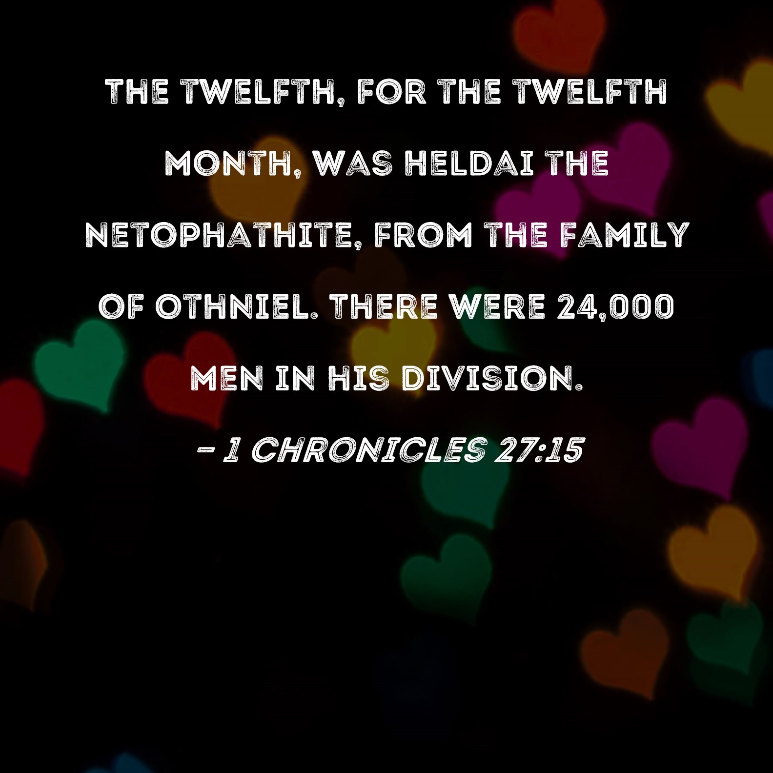 1 Chronicles 27:15 The twelfth, for the twelfth month, was Heldai the Netophathite, from the family of Othniel. There were 24,000 men in his division.