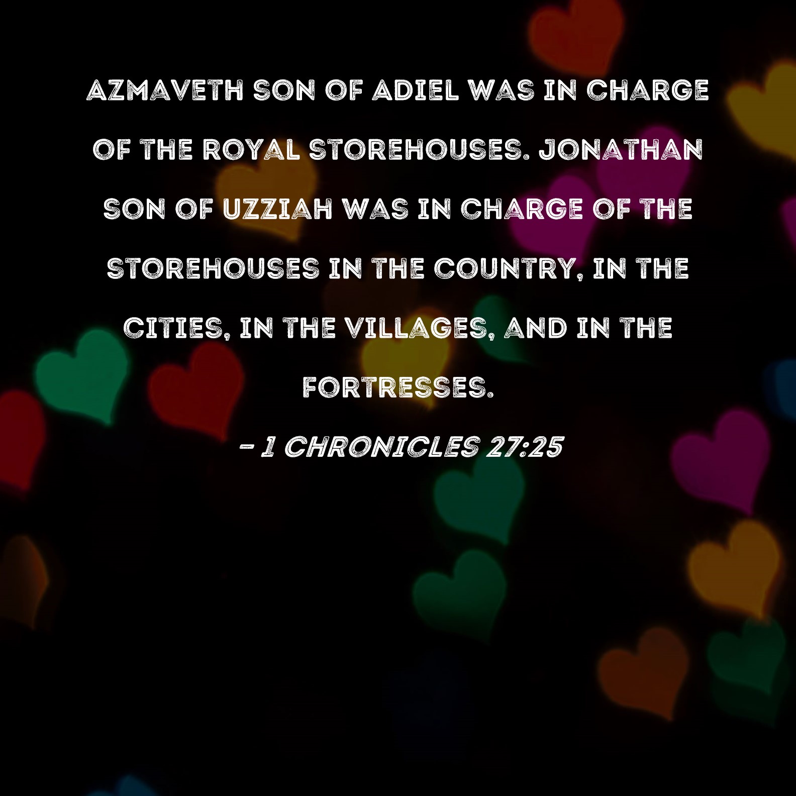 1 Chronicles 27:25 Azmaveth son of Adiel was in charge of the royal storehouses. Jonathan son of Uzziah was in charge of the storehouses in the country, in the cities, in the villages, and in the fortresses.
