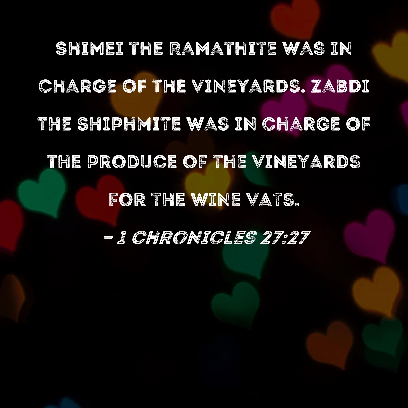 1 Chronicles 27:27 Shimei the Ramathite was in charge of the vineyards. Zabdi the Shiphmite was in charge of the produce of the vineyards for the wine vats.