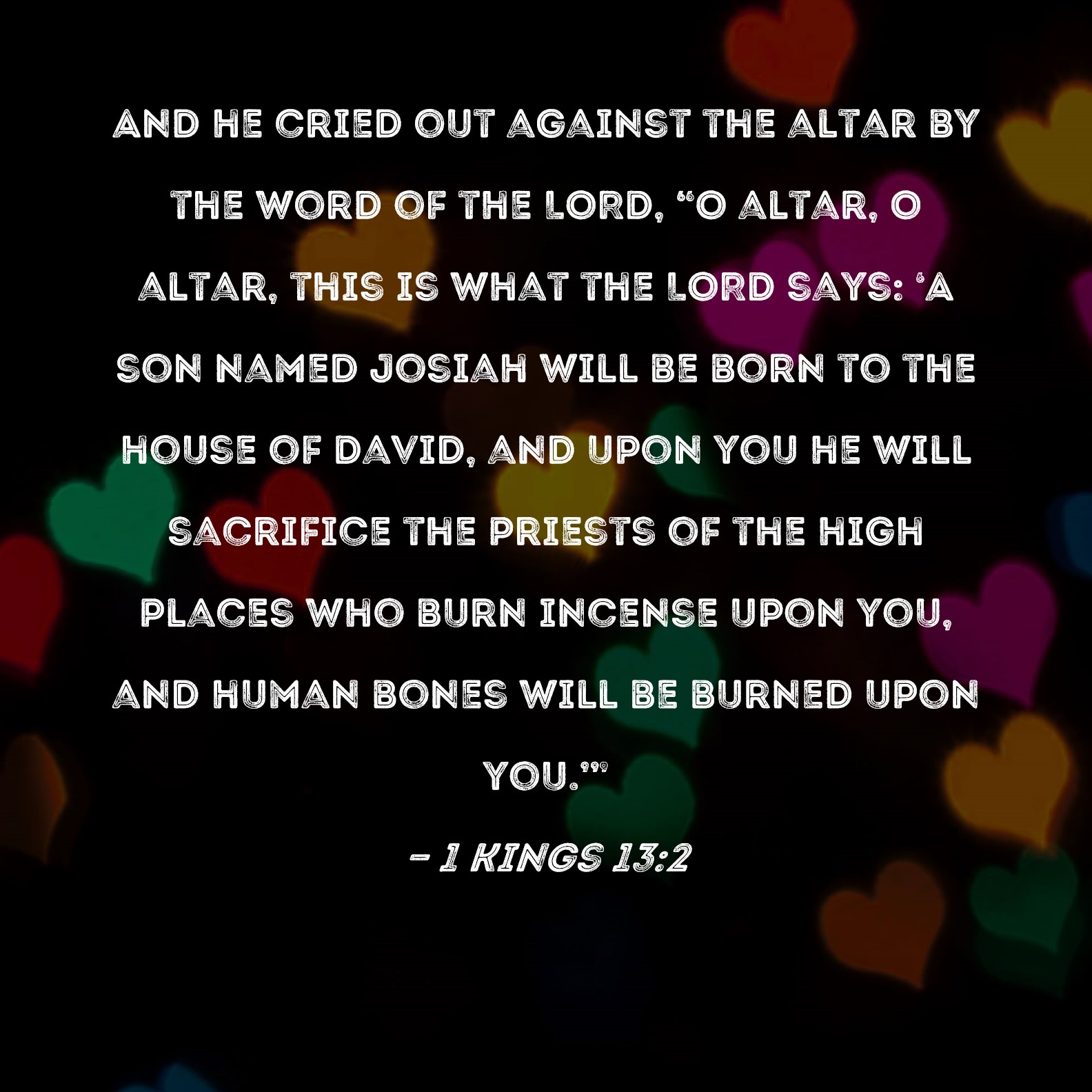1 Kings 13:2 And he cried out against the altar by the word of the LORD, "O altar, O altar, this is what the LORD says: 'A son named Josiah will be born to the house of David, and upon you he will sacrifice the priests of the high places who burn incense upon you, and human bones will be burned upon you.'"