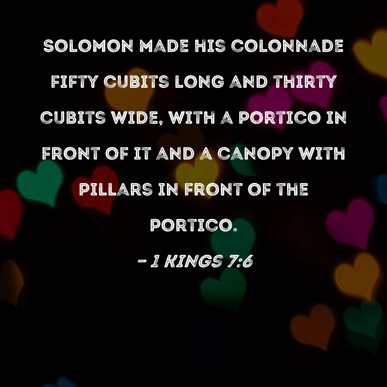 1 Kings 7:6 Solomon made his colonnade fifty cubits long and thirty cubits wide, with a portico in front of it and a canopy with pillars in front of the portico.