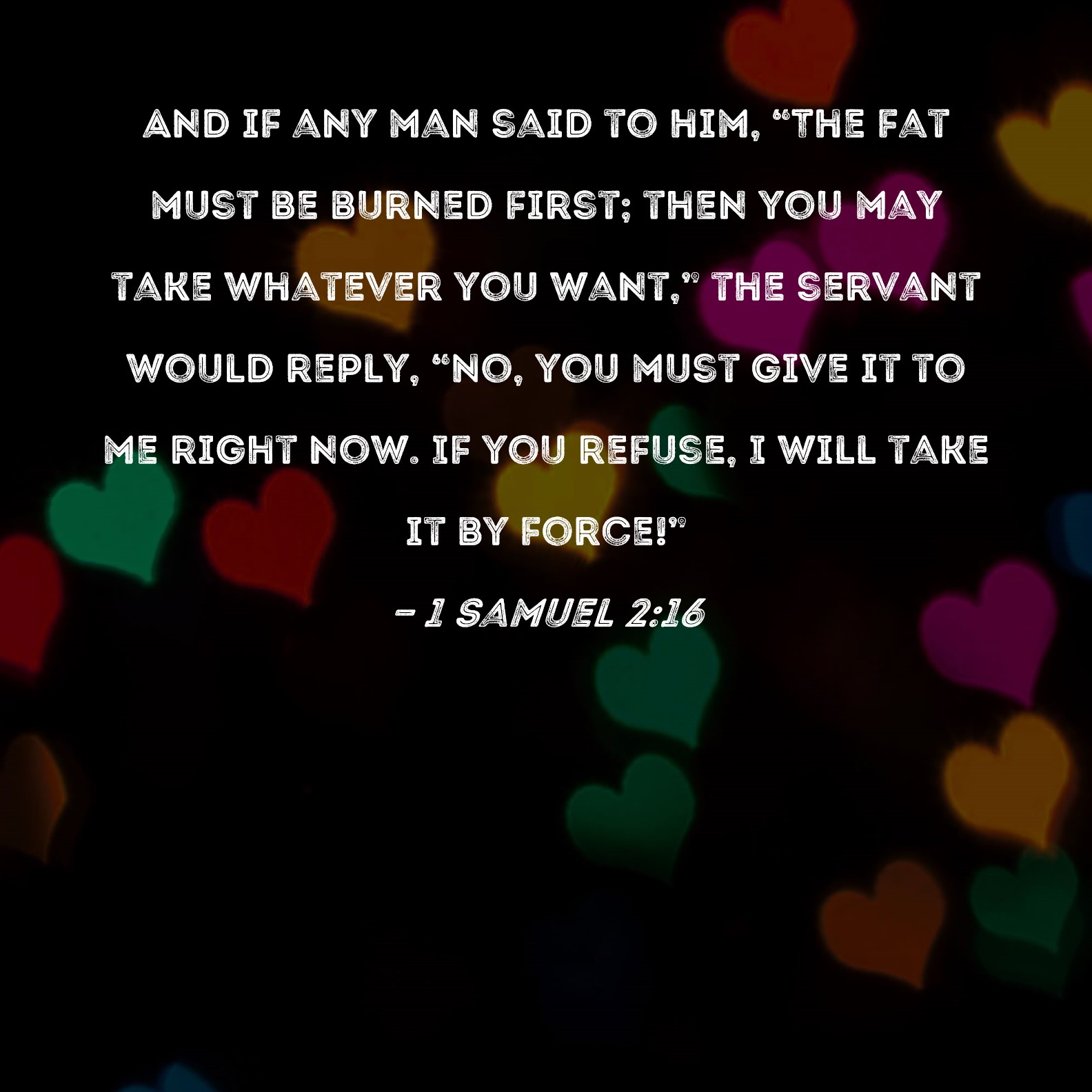 1 Samuel 2:16 And if any man said to him, "The fat must be burned first; then you may take whatever you want," the servant would reply, "No, you must give it to me right now. If you refuse, I will take it by force!"