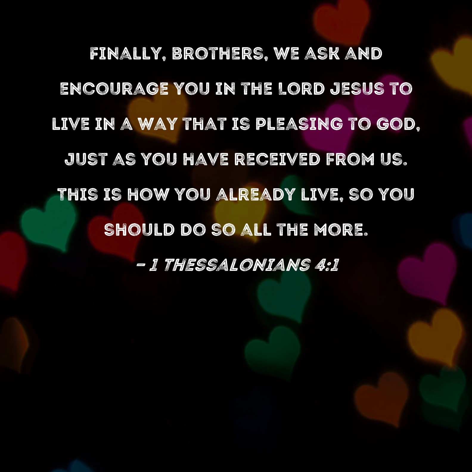1 Thessalonians 4:1 Finally, brothers, we ask and encourage you in the Lord Jesus to live in a way that is pleasing to God, just as you have received from us. This is how you already live, so you should do so all the more.