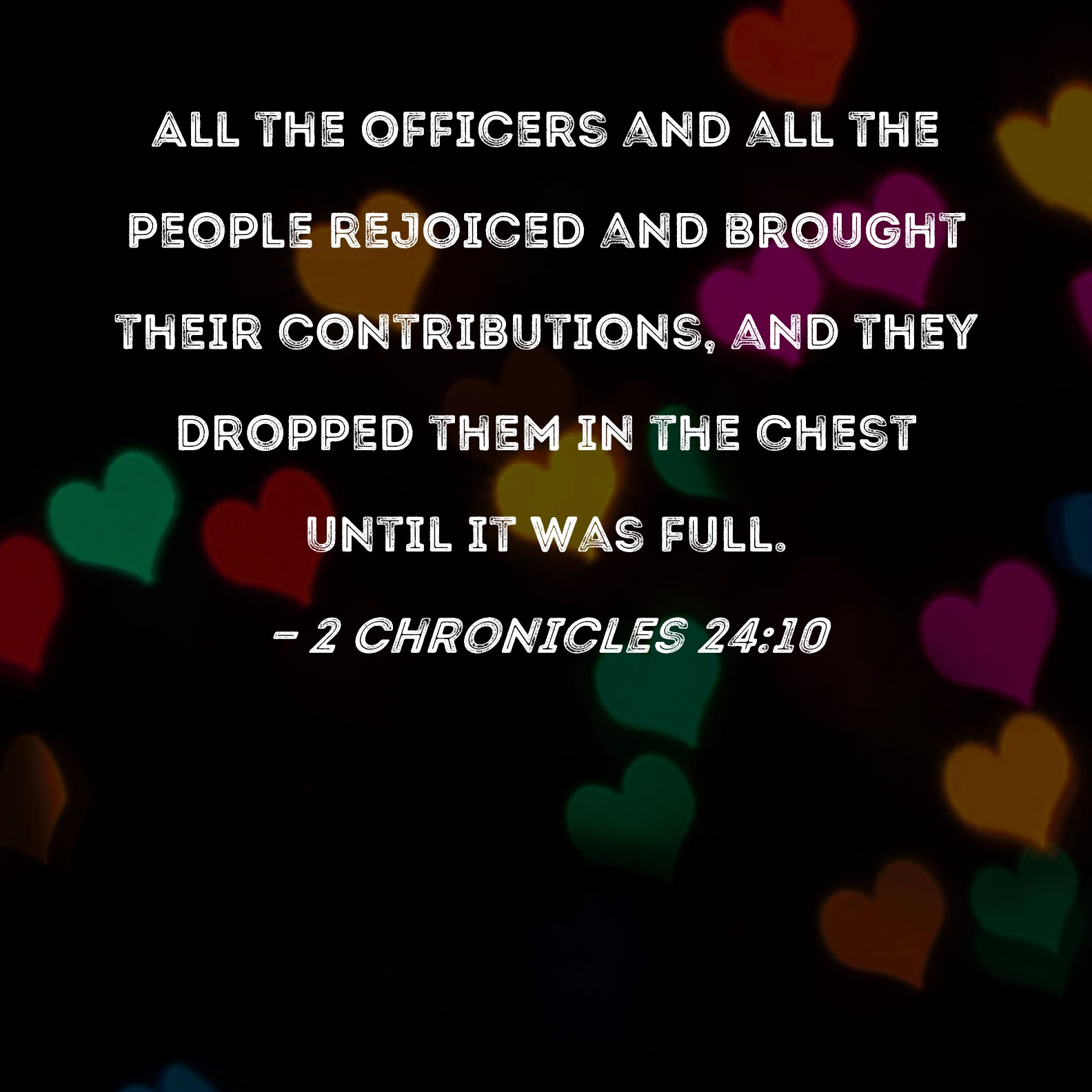 2 Chronicles 24:10 All the officers and all the people rejoiced and brought their contributions, and they dropped them in the chest until it was full.