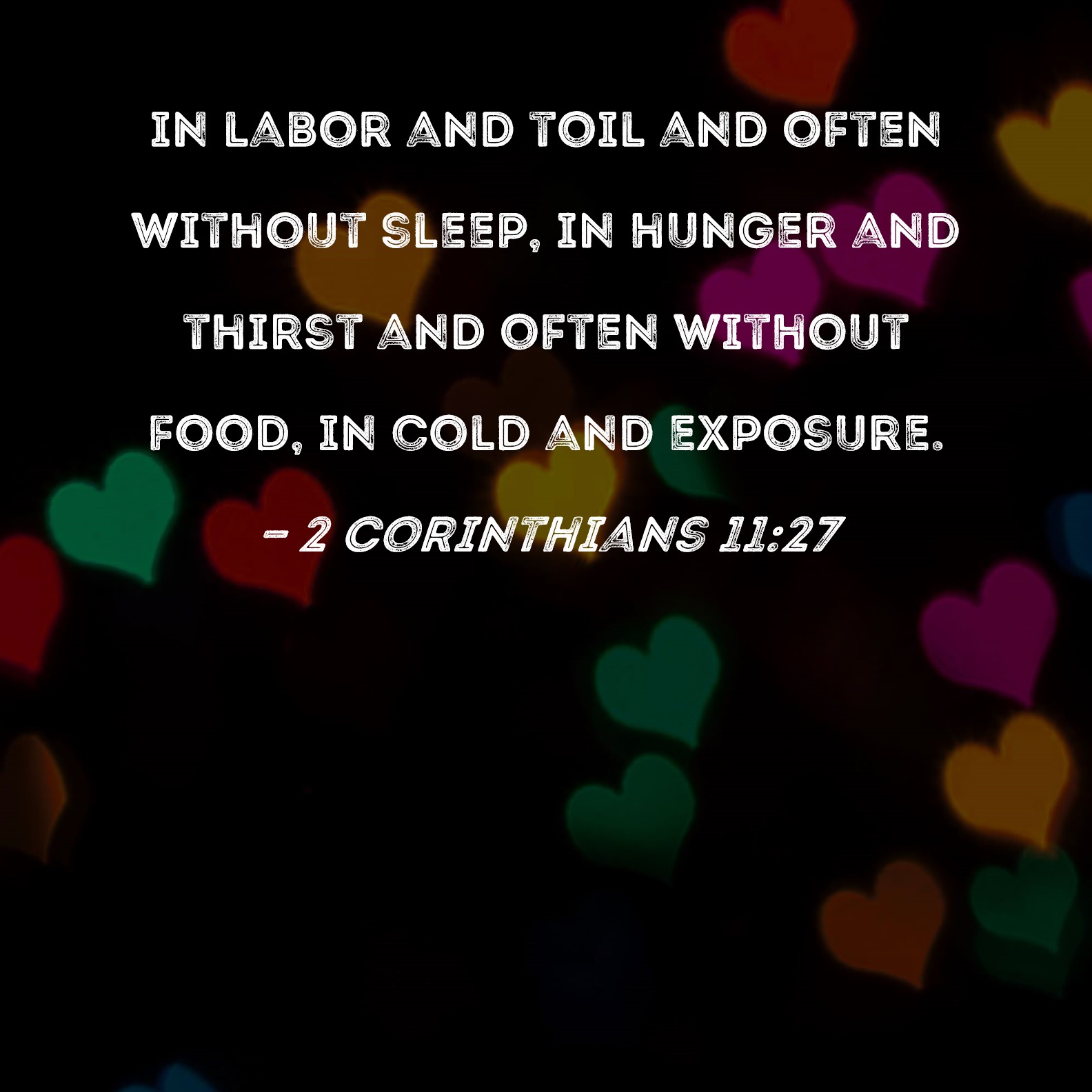 2 Corinthians 11:27 in labor and toil and often without sleep, in hunger and thirst and often without food, in cold and exposure.
