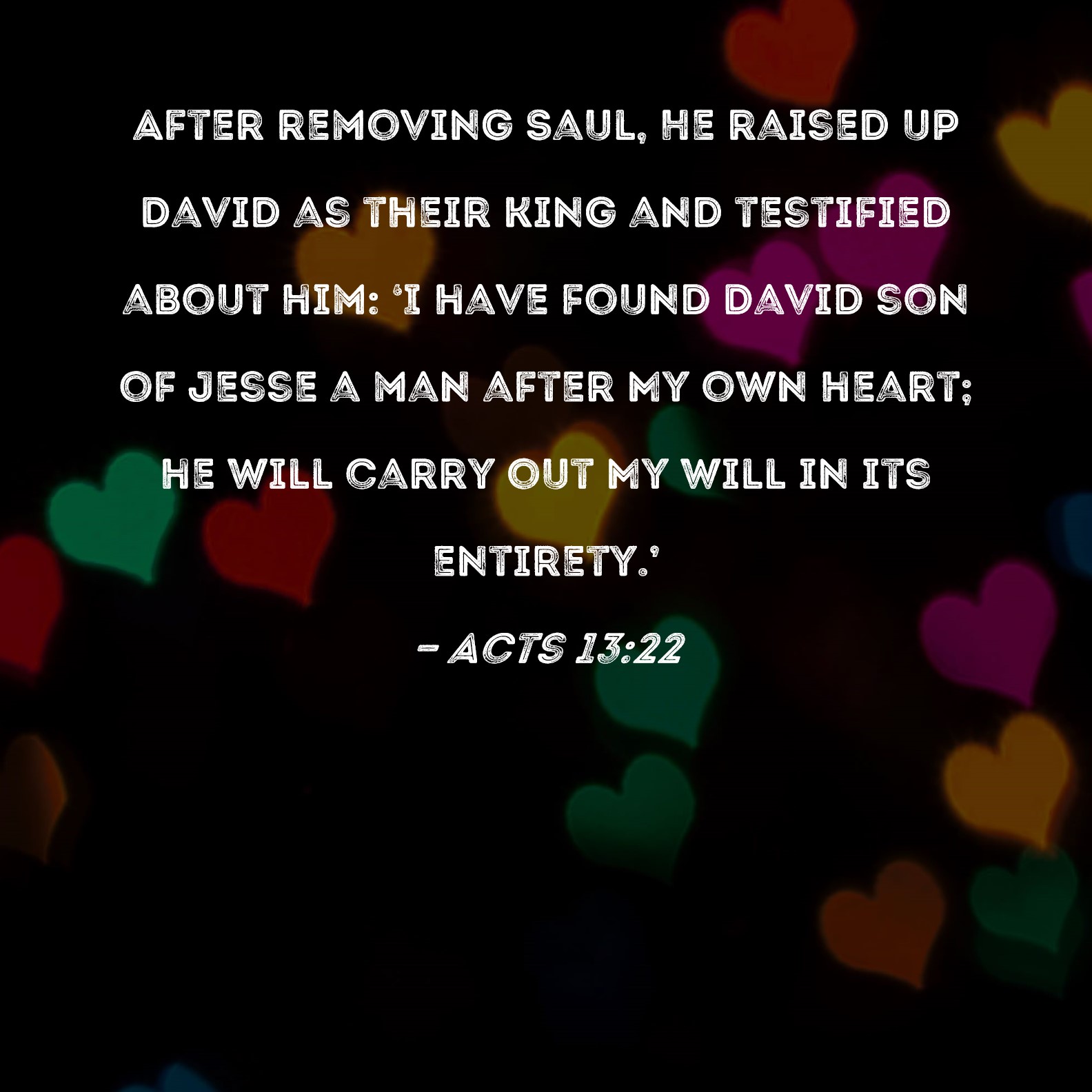 Acts 13:22 After removing Saul, He raised up David as their king and testified about him: 'I have found David son of Jesse a man after My own heart; he will carry out My will in its entirety.'