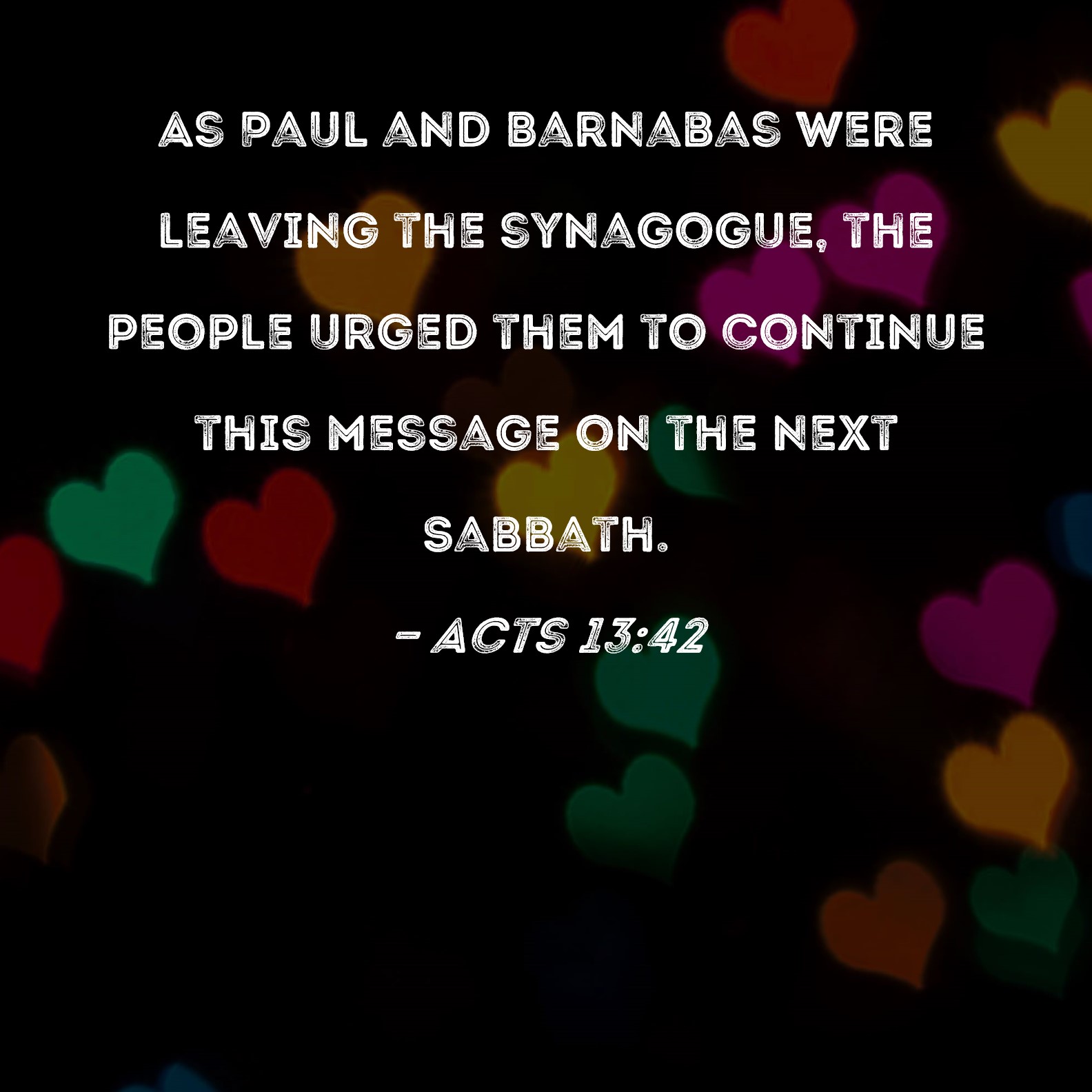 Acts 13:42 As Paul and Barnabas were leaving the synagogue, the people urged them to continue this message on the next Sabbath.