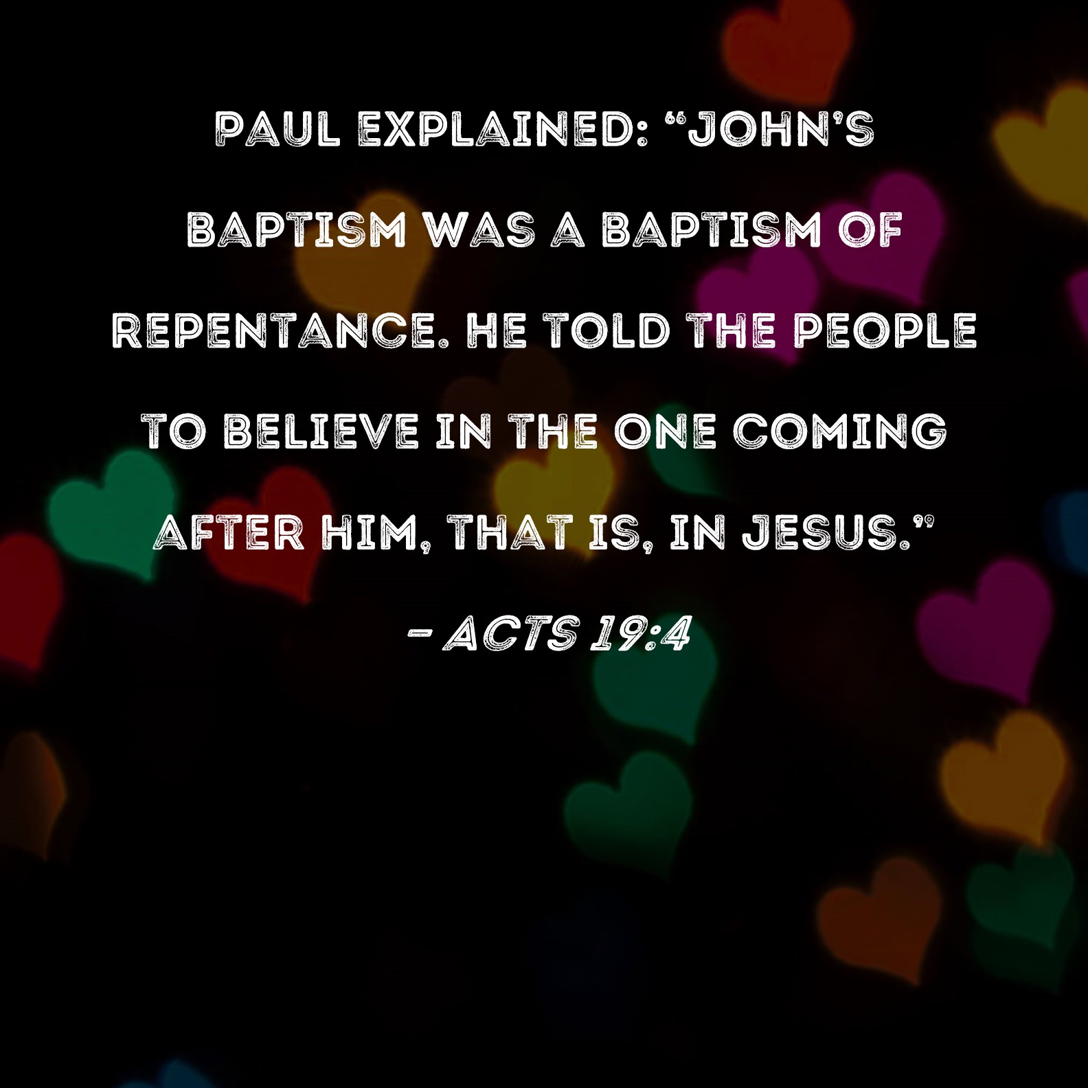 Acts 19:4 Paul explained: "John's baptism was a baptism of repentance. He told the people to believe in the One coming after him, that is, in Jesus."