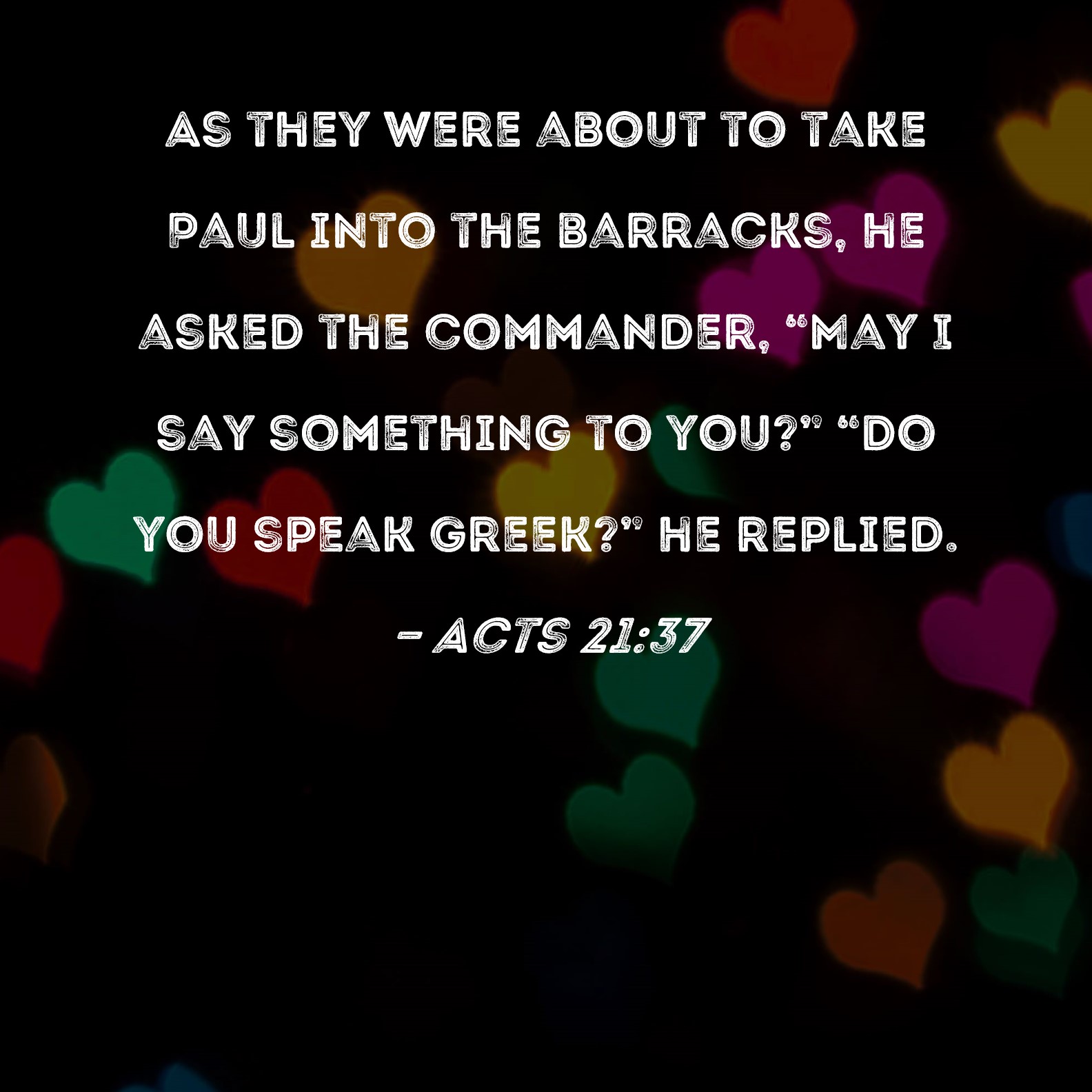 Acts 21:37 As they were about to take Paul into the barracks, he asked the commander, "May I say something to you?" "Do you speak Greek?" he replied.