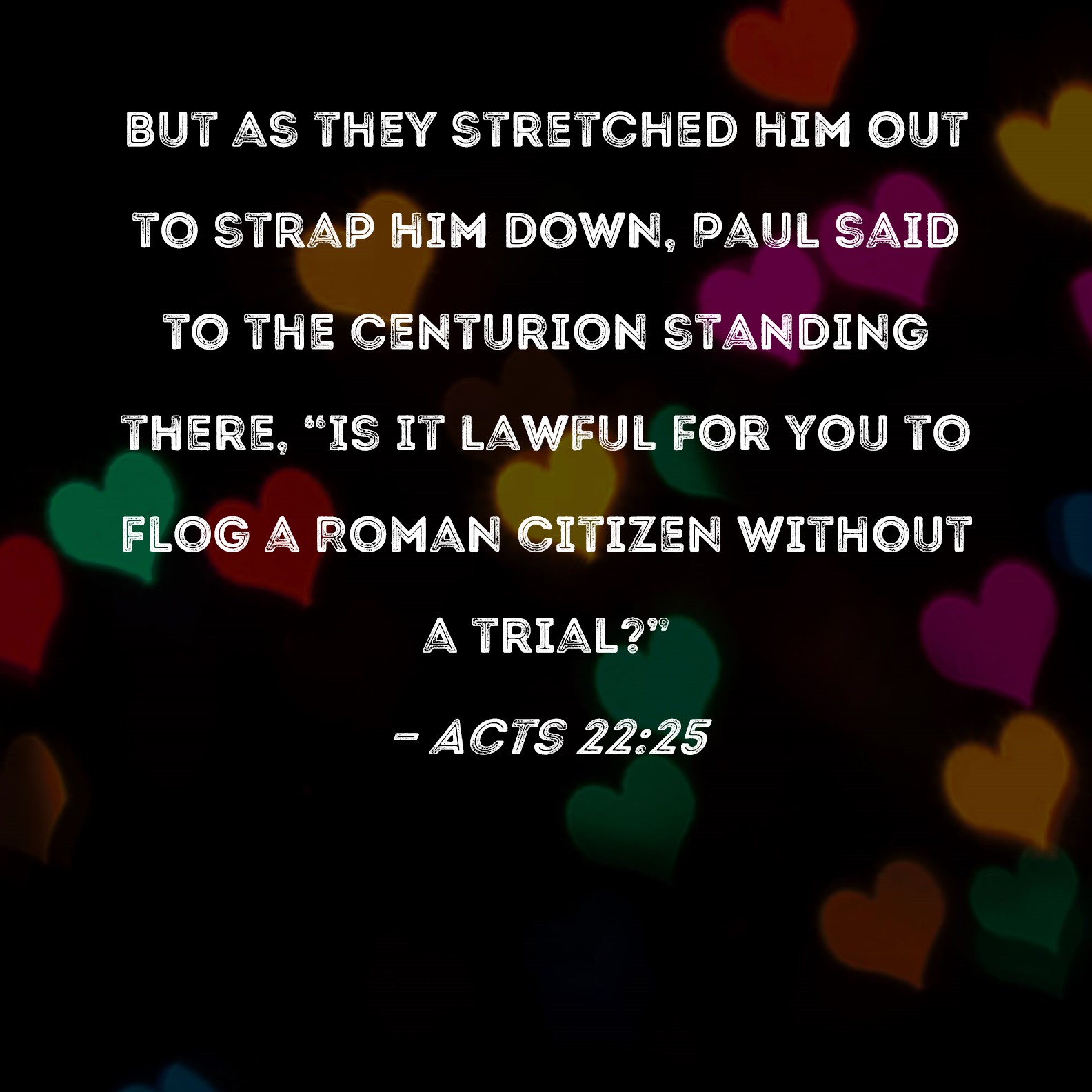 Acts 22:25 But as they stretched him out to strap him down, Paul said to the centurion standing there, "Is it lawful for you to flog a Roman citizen without a trial?"