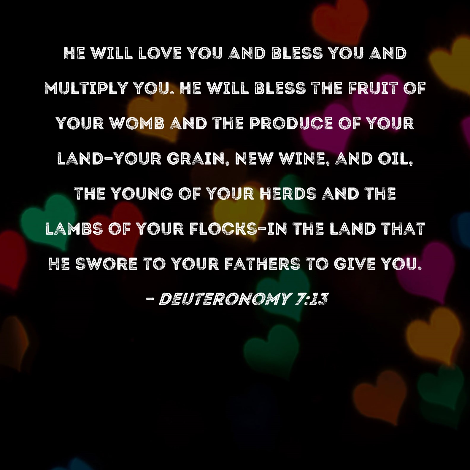 Deuteronomy 7:13 He will love you and bless you and multiply you. He will bless the fruit of your womb and the produce of your land--your grain, new wine, and oil, the young of your herds and the lambs of your flocks--in the land that He swore to your fathers to give you.