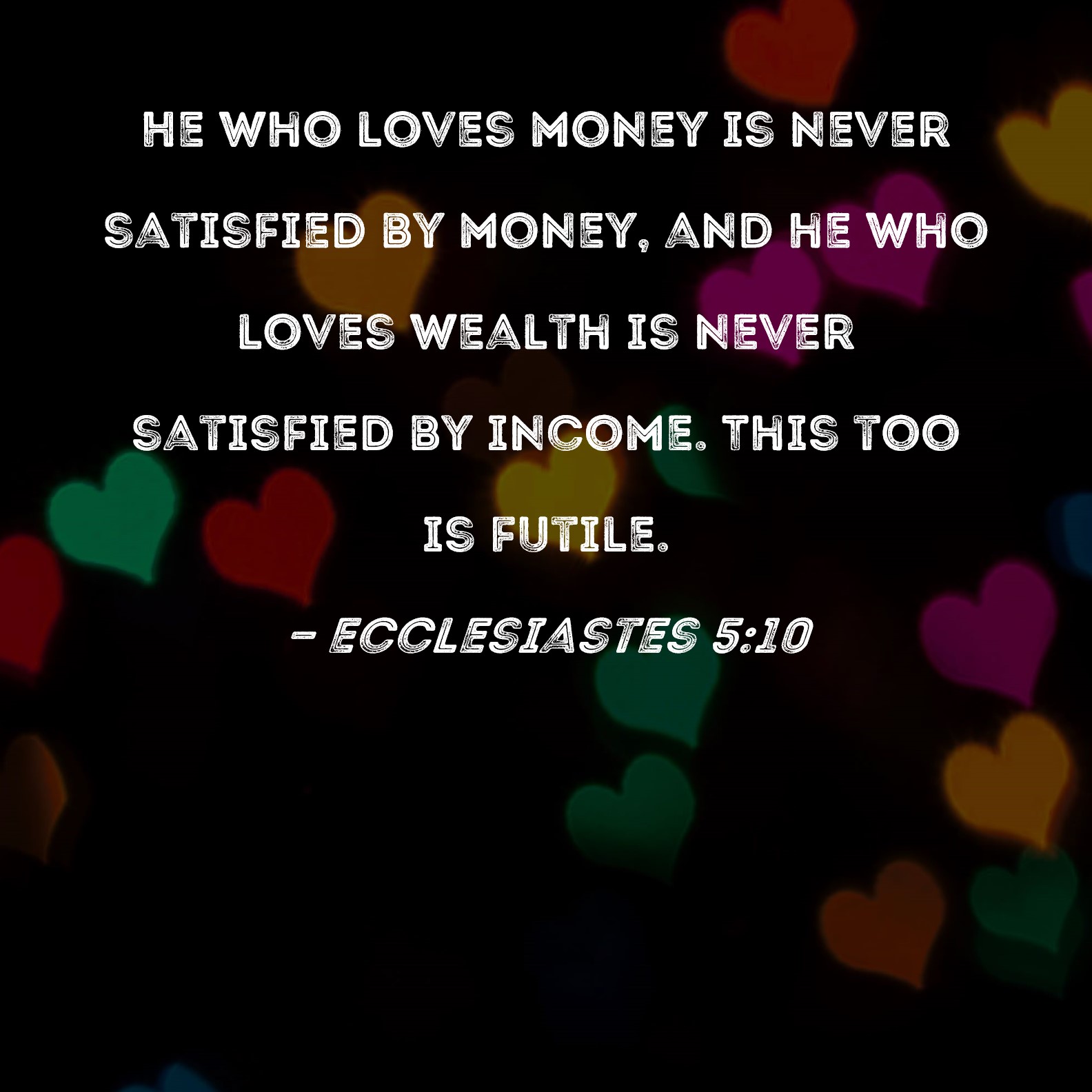 Ecclesiastes 5:10 He who loves money is never satisfied by money, and he who loves wealth is never satisfied by income. This too is futile.