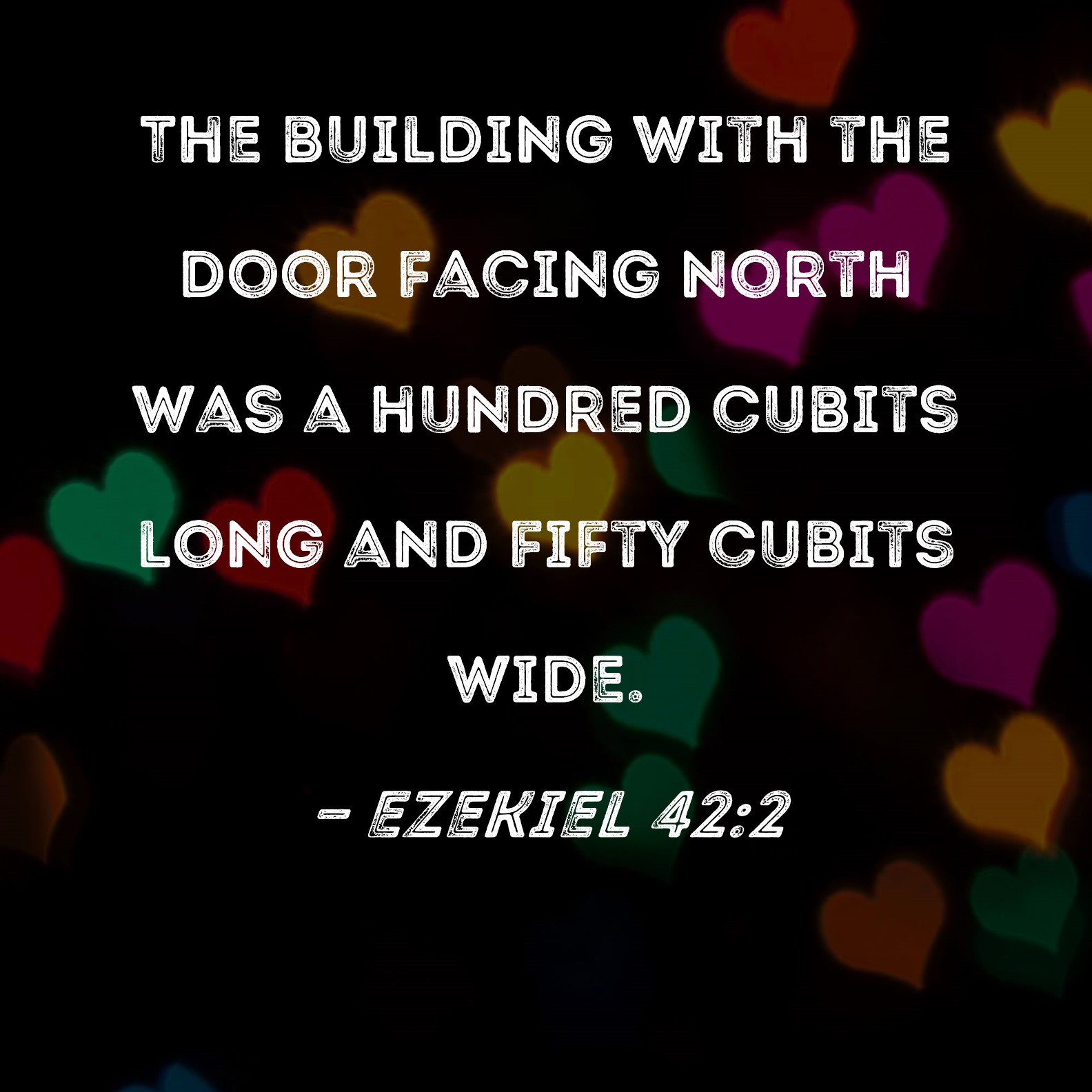 Ezekiel 42:2 The building with the door facing north was a hundred cubits long and fifty cubits wide.